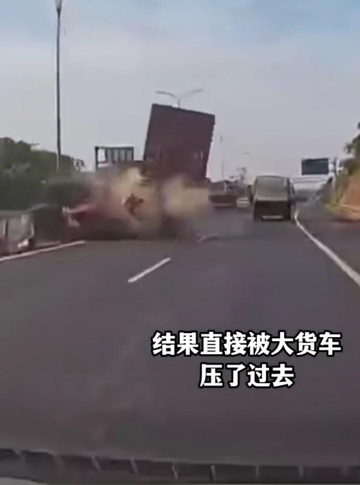 脾气太大了!9月2日,浙江绍兴,红色小车想从道路最右侧超车,不料被一辆大货车抢了先,大货车打了右转向灯,变道到道路右侧行驶,导致小车没能超车成功。 小车司机的脾气上来了,在大货车变道到左侧道路上行驶时,超车到大货车的前面,试图去别车,不料二车发生了碰撞,小车翻了车,大货车从小车上压了过去! 平常开车,大家都会明白一个道理:远离大货车! 因为小车一旦和大货车发生碰撞可不是闹着玩的!