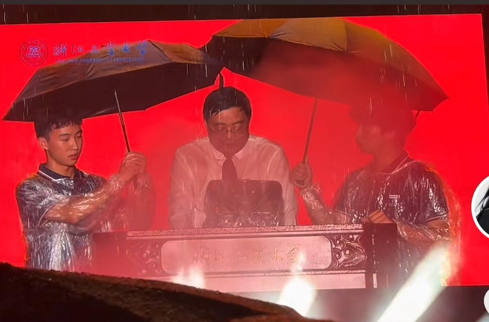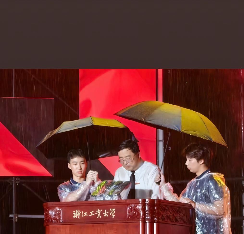 浙江工业大学,可能做梦都不会想到,有一天会成为最硬核“双一流”! 9 月 3 日晚,浙江工业大学的开学典礼正如火如荼地进行着。校长站在台上,正在发表满怀激情的致辞,可天公偏偏不作美,豆大的雨点毫无征兆的砸下来,瞬间让整个典礼现场变得手忙脚乱。 工作人员看到后,迅速为校长送上雨衣,校长摆手示意不要。这时,两位正义感爆棚的 00 后同学,身着透明雨衣,如同两位英勇的 “护花使者”,迅速冲上舞台,一人手持一把雨伞,目标明确 是要为校长遮风挡雨。 然而,这两同学雨伞一撑开,问题就来了。只见那雨水顺着两把伞交叠的缝隙,像是找到了一条专属滑道,两伞之间的雨水汇聚成一道水柱,不偏不倚,直直地浇到了校长的头顶。实现了真正意义上的“双一流”。 看到校长原本笔挺的白色衬衫,瞬间被雨水湿透,紧紧地贴在身上,瞬间浇成了落汤鸡,台下同学们被这一幕逗的前仰后合。 网友们调侃,两位同学是史上最没有眼力见的学生。可我认为,这恰恰就是 00 后的可爱之处,他们没有那些老套的世故与圆滑, 总会以他们独特的方式给我们带来意外和欢乐!