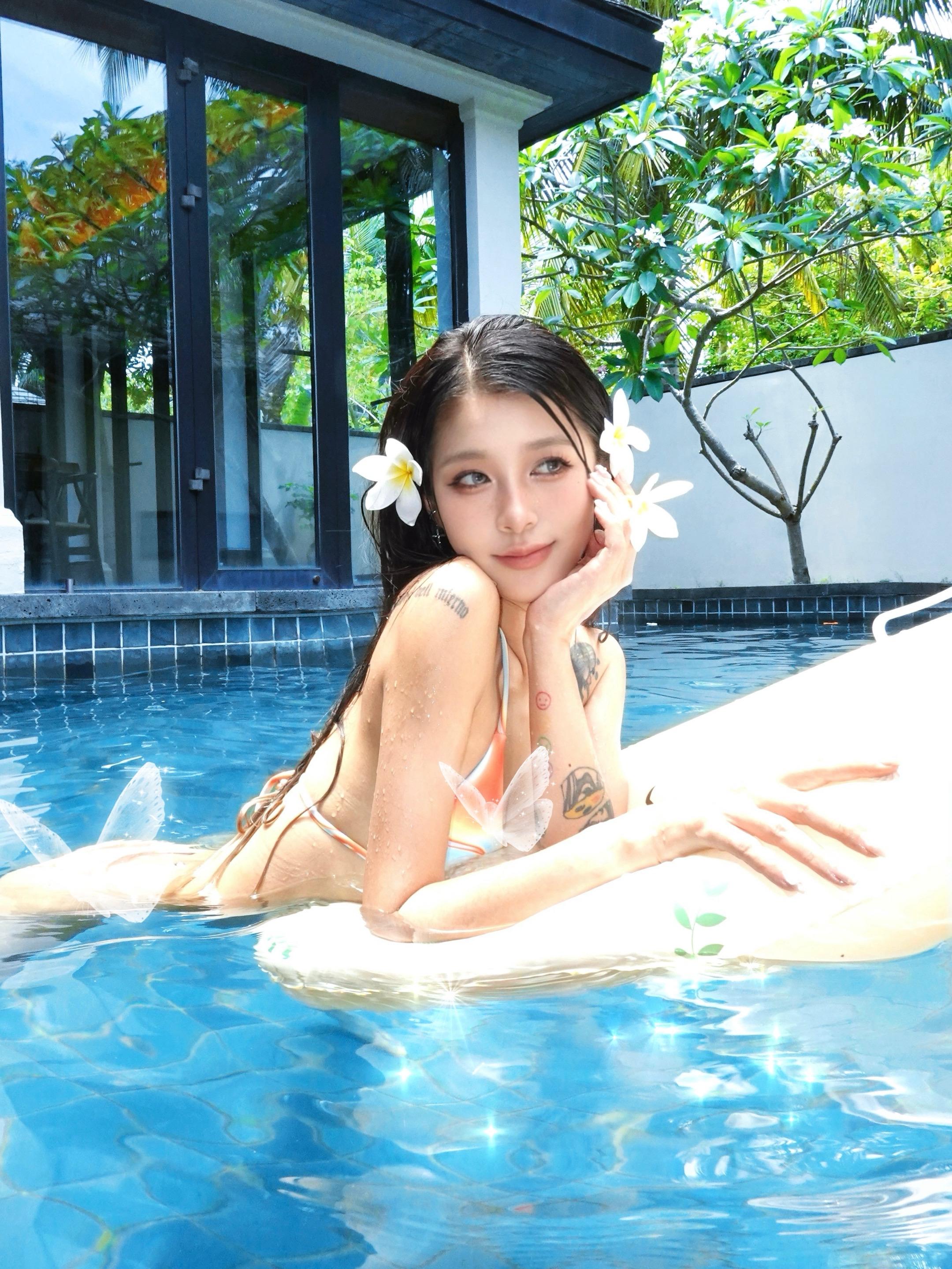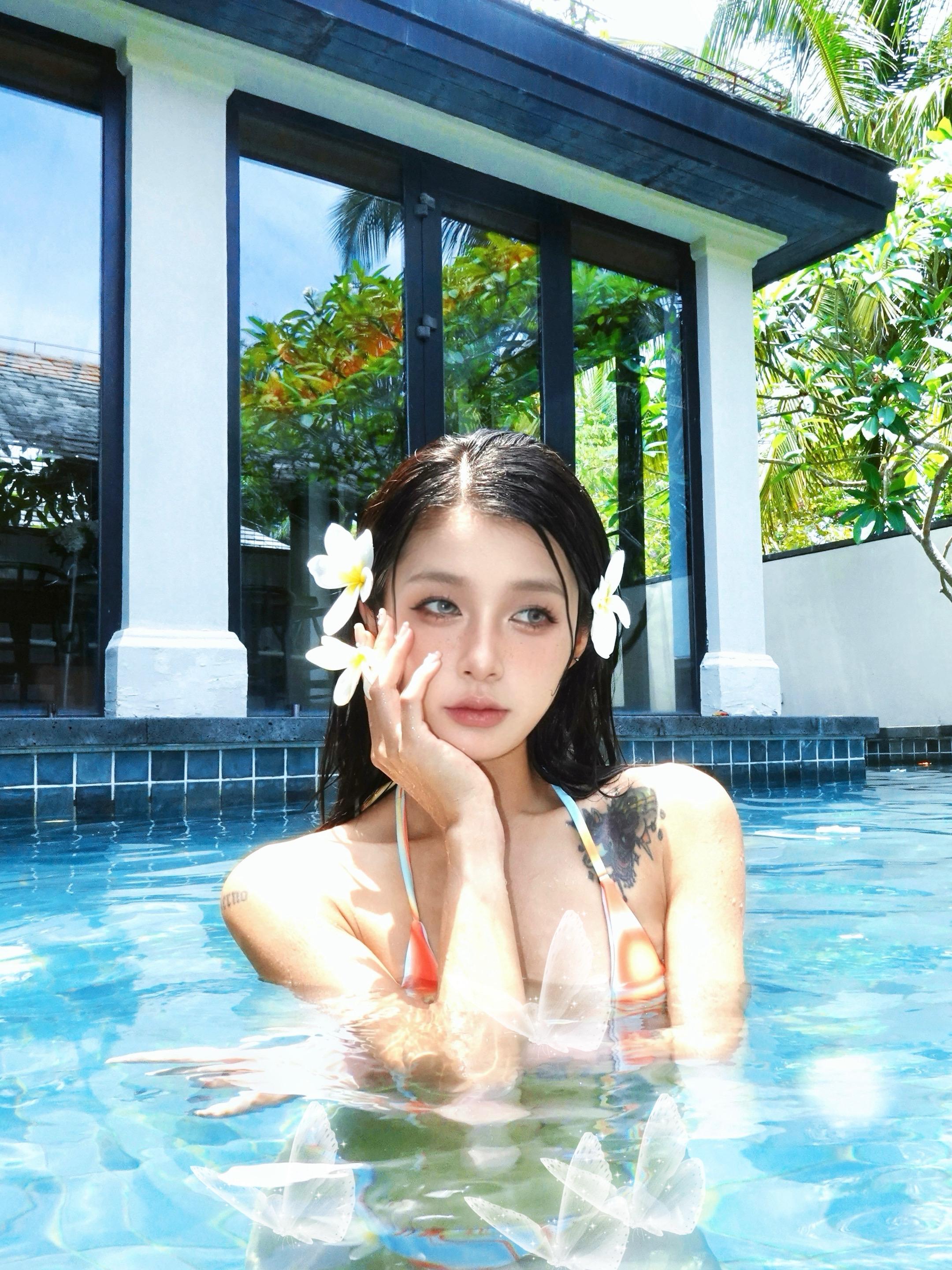 甜辣pose✨泳池拍照之如何用鸡蛋花出片 泳池正常穿搭无不良影响