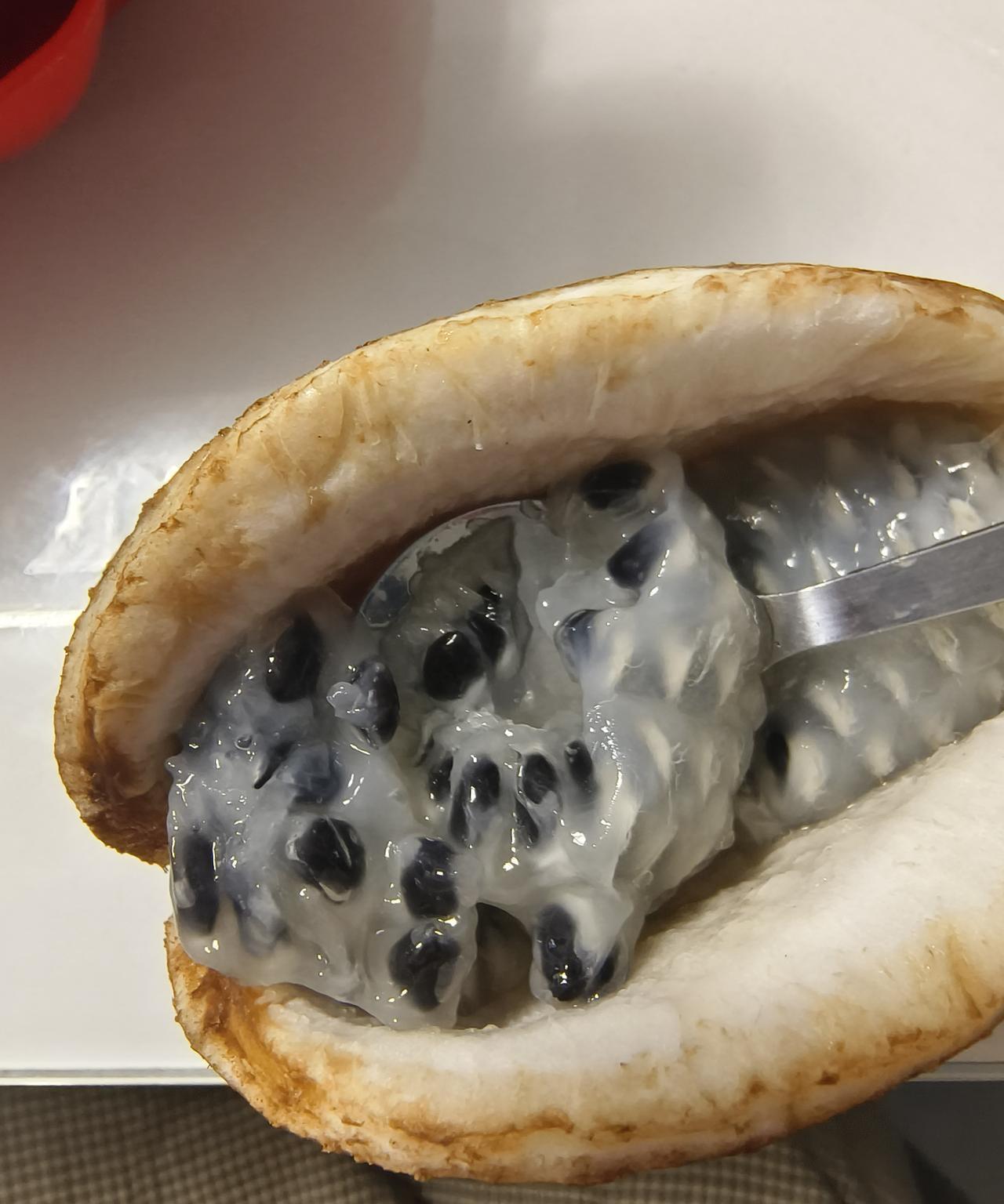 第一次吃,真的有点意外。 我是安徽的,从来没有吃过这个。 我在网上看到的,说好吃。 现在正是果子成熟的季节,八月果八月炸, 云南特产,好奇买了5斤回来尝尝,到了货都已经炸了好几个了,用勺子挖了一口吃,味道还好,想问问有没有人吃过,就是不知道里面籽能不能吃? #万能生活指南#