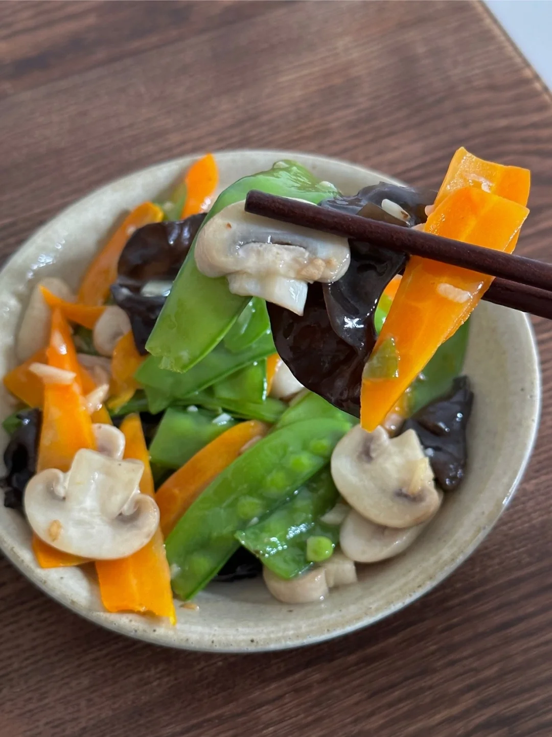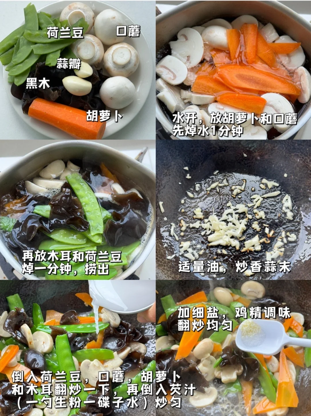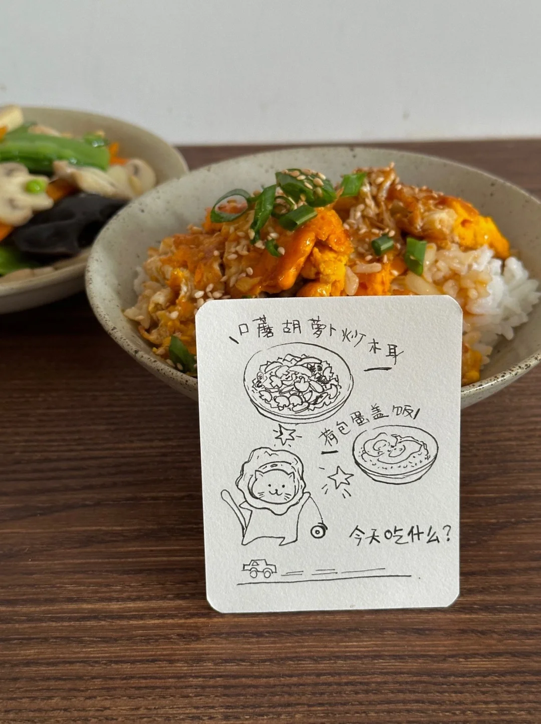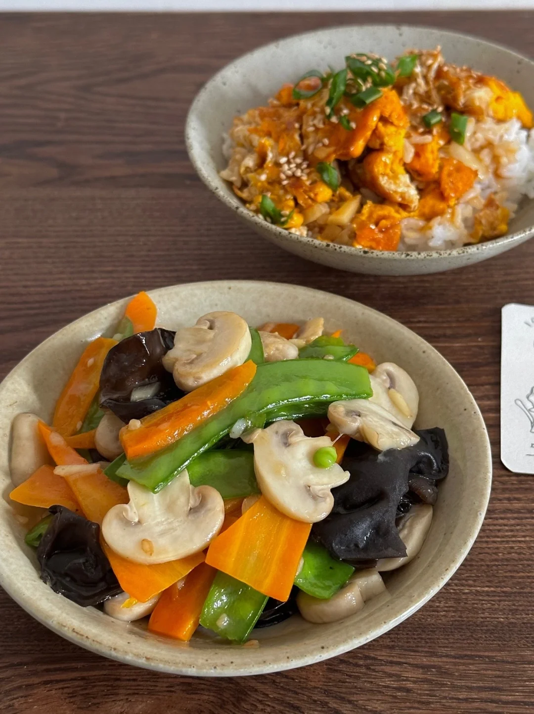 今日午餐:糖醋蛋盖饭,口蘑胡萝卜炒木耳