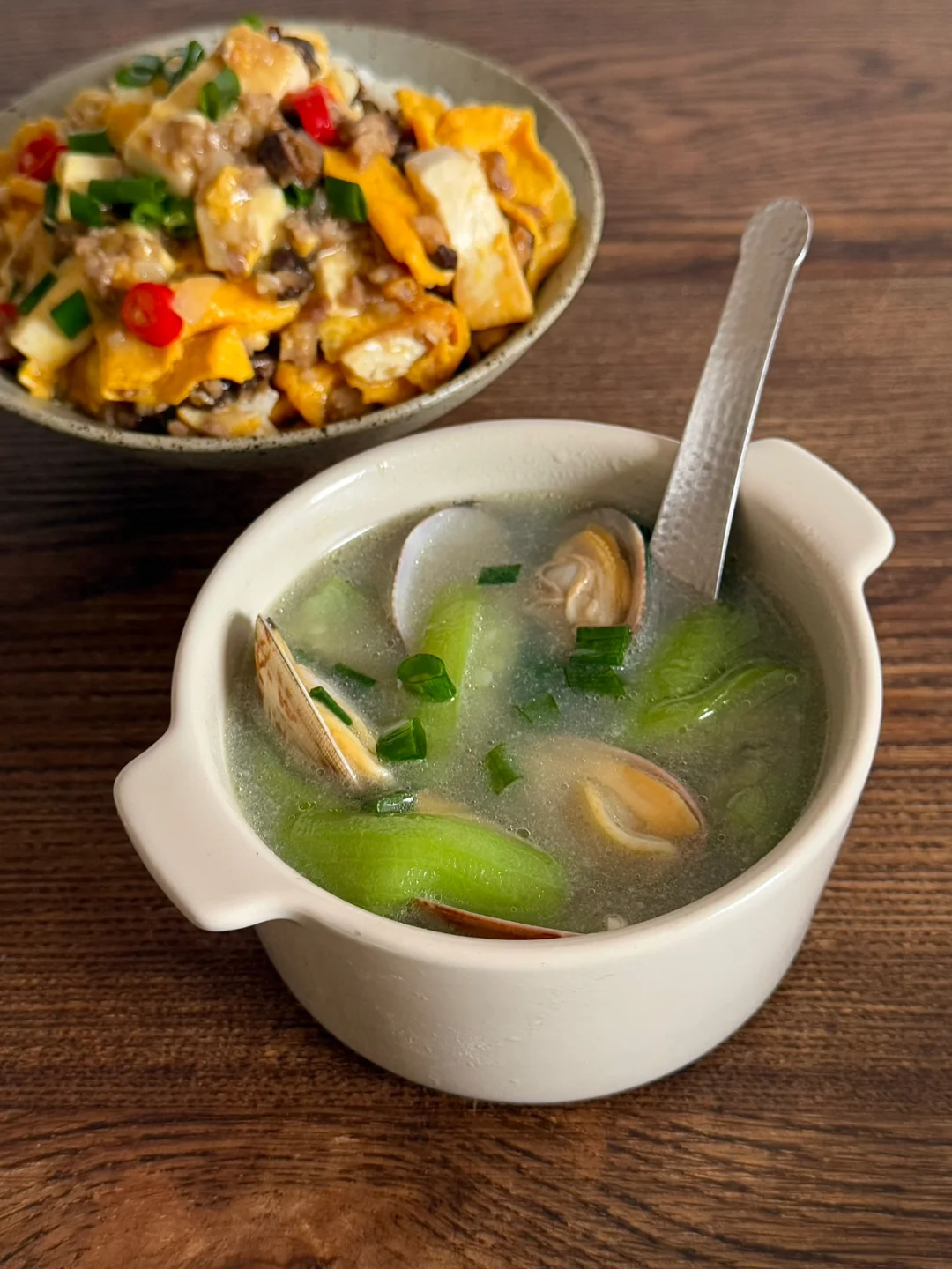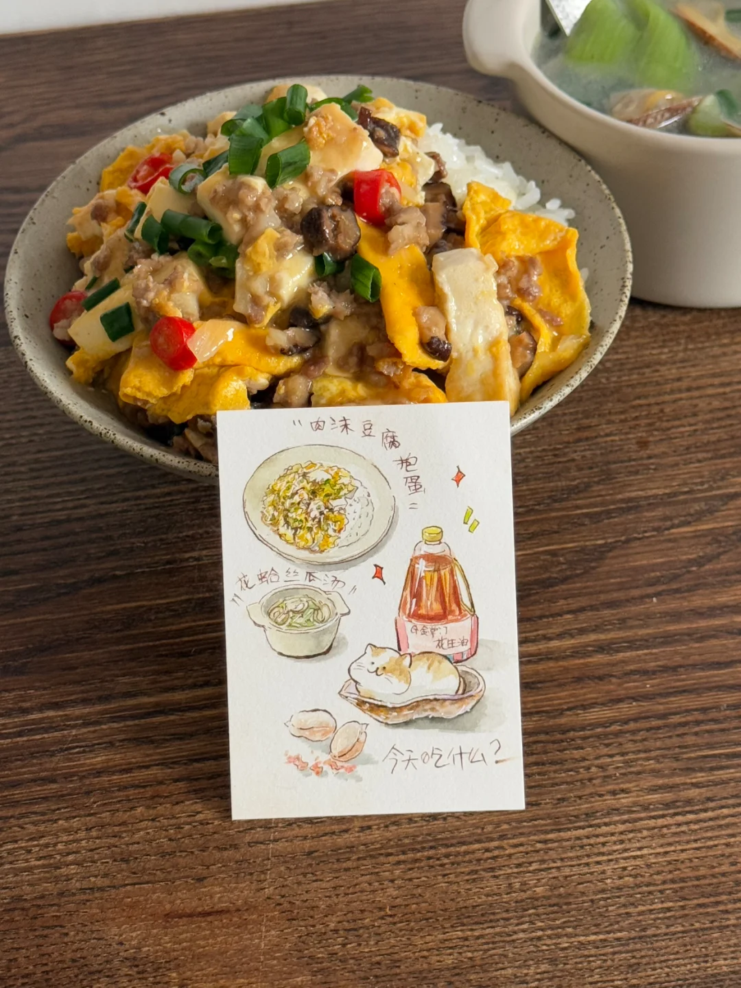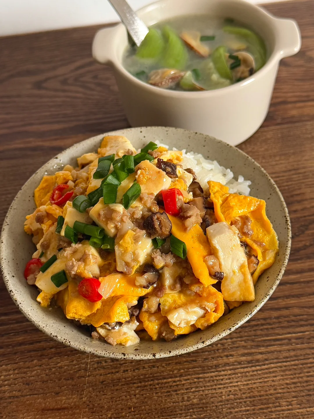 今日午餐:肉沫豆腐抱蛋盖饭,丝瓜花蛤汤