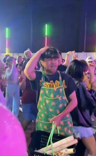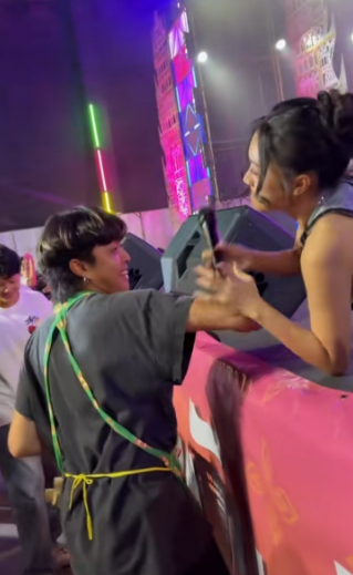 看看小伙子出力不讨好的下场,看见美女在台上热情的歌唱,小伙子主动提一篮子礼物送给