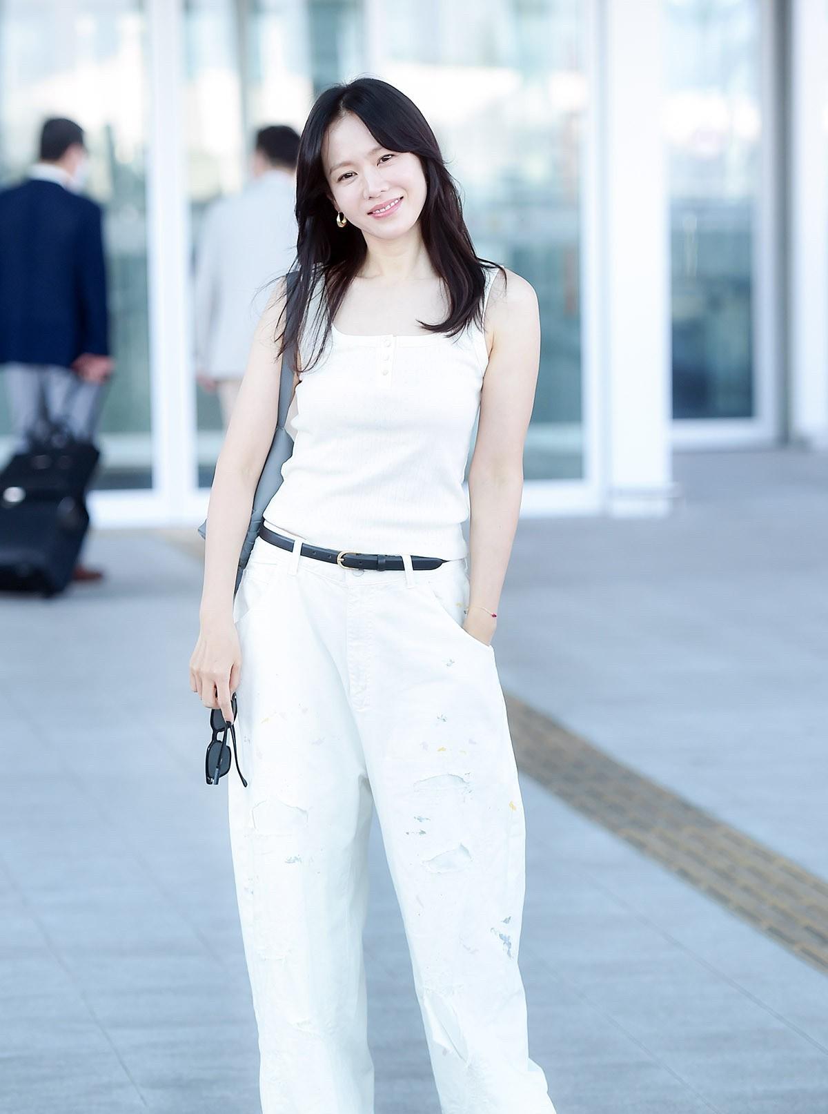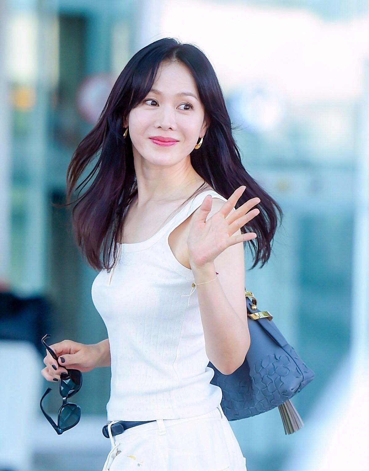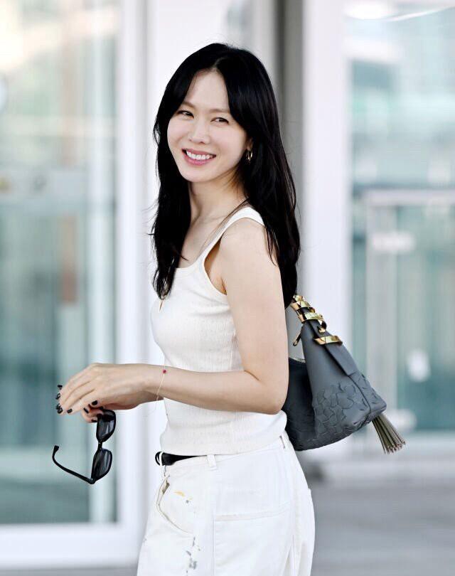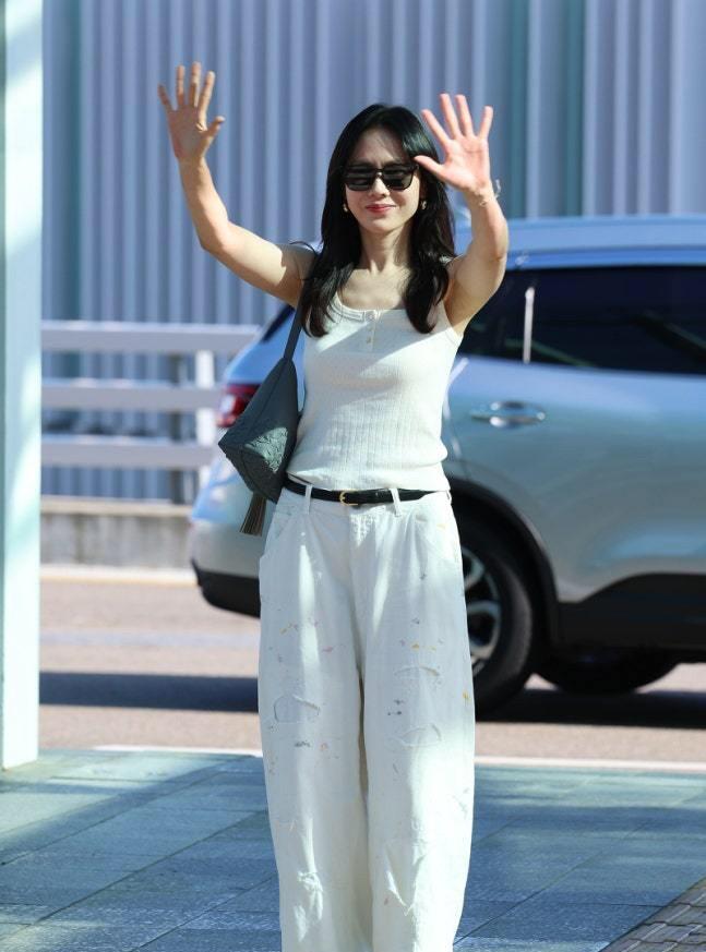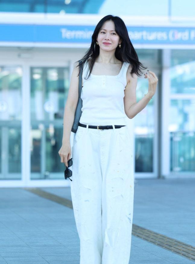 孙艺珍机场照,简单的白色背心搭配白色阔腿裤就已经足够迷人,人怎么可以漂亮成这样啊。