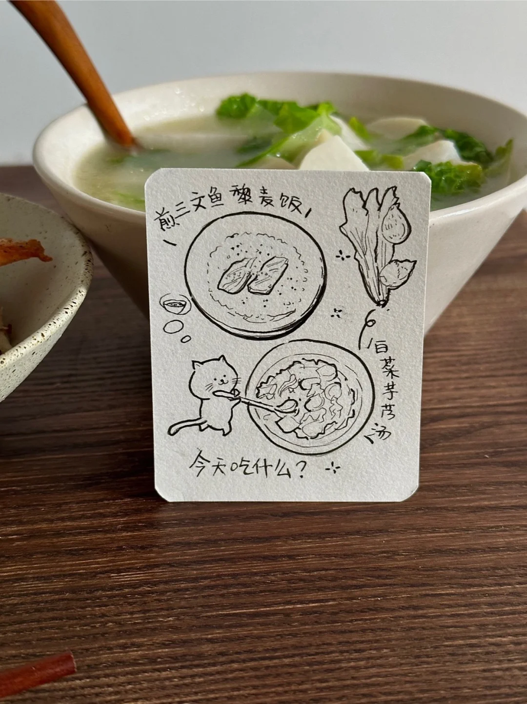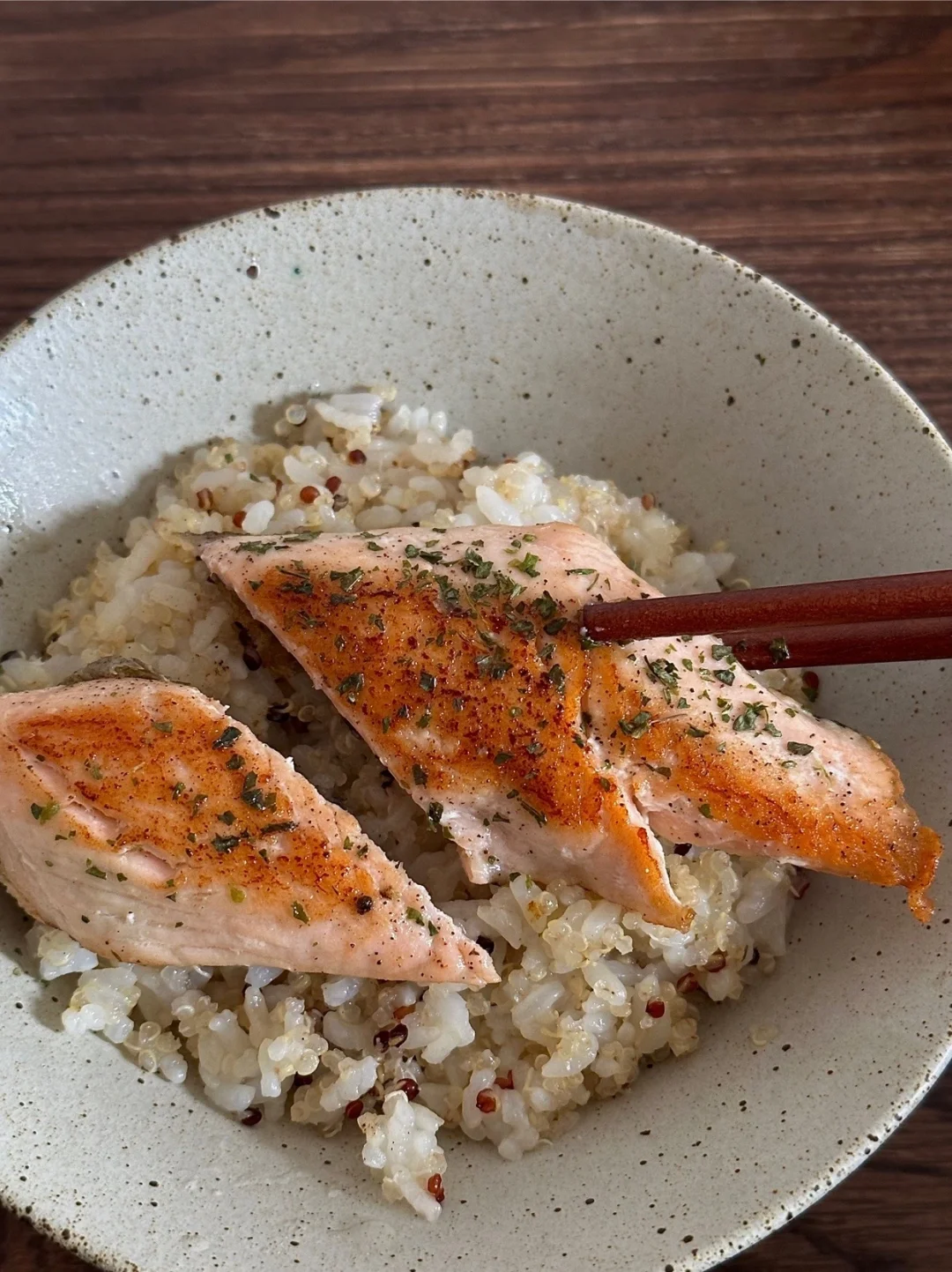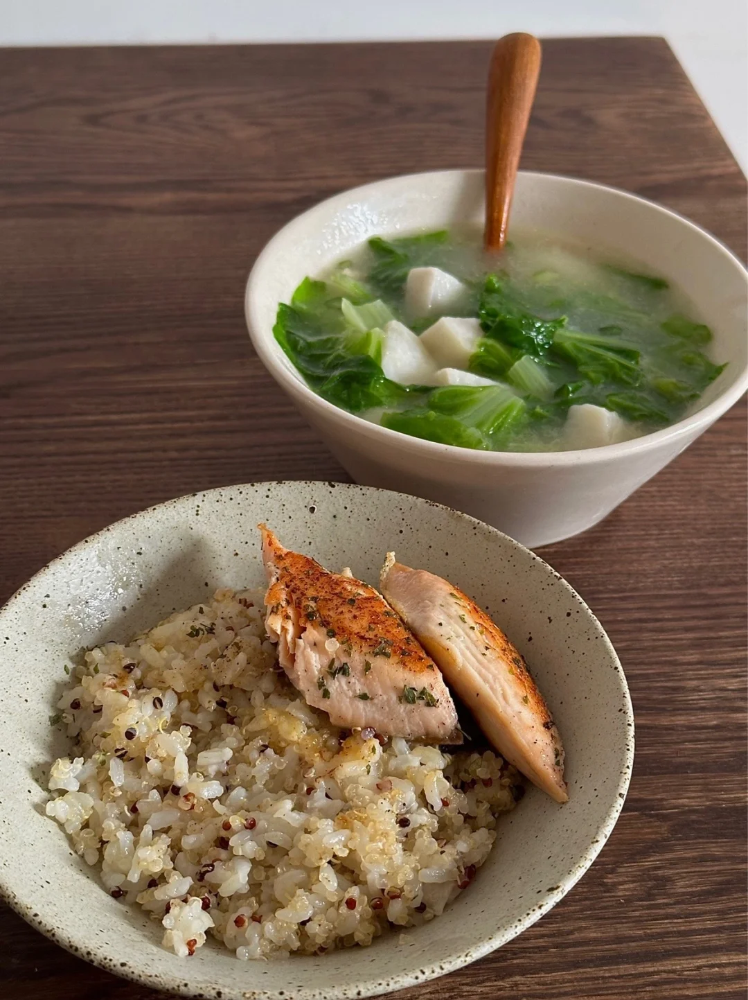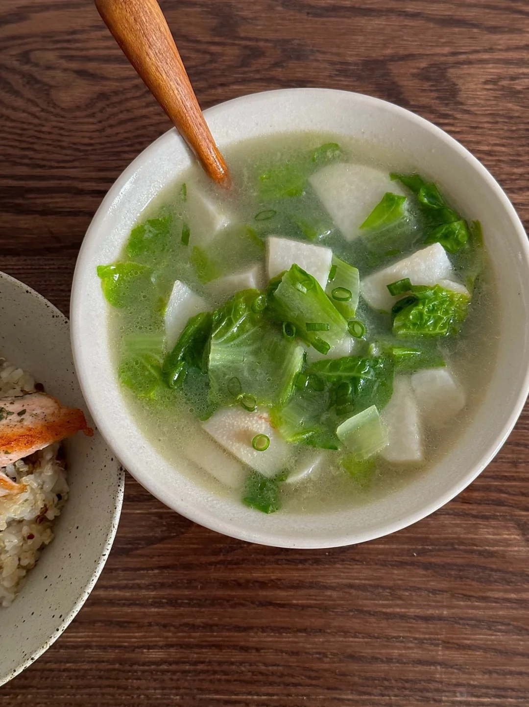 今日午餐:煎三文鱼藜麦饭,白菜芋艿汤