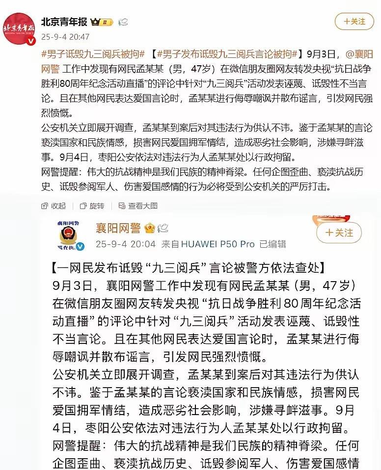 湖北襄阳47岁的男子孟某,在9.3阅兵期间,发表歪曲、亵渎抗战历史、诋毁参阅军人