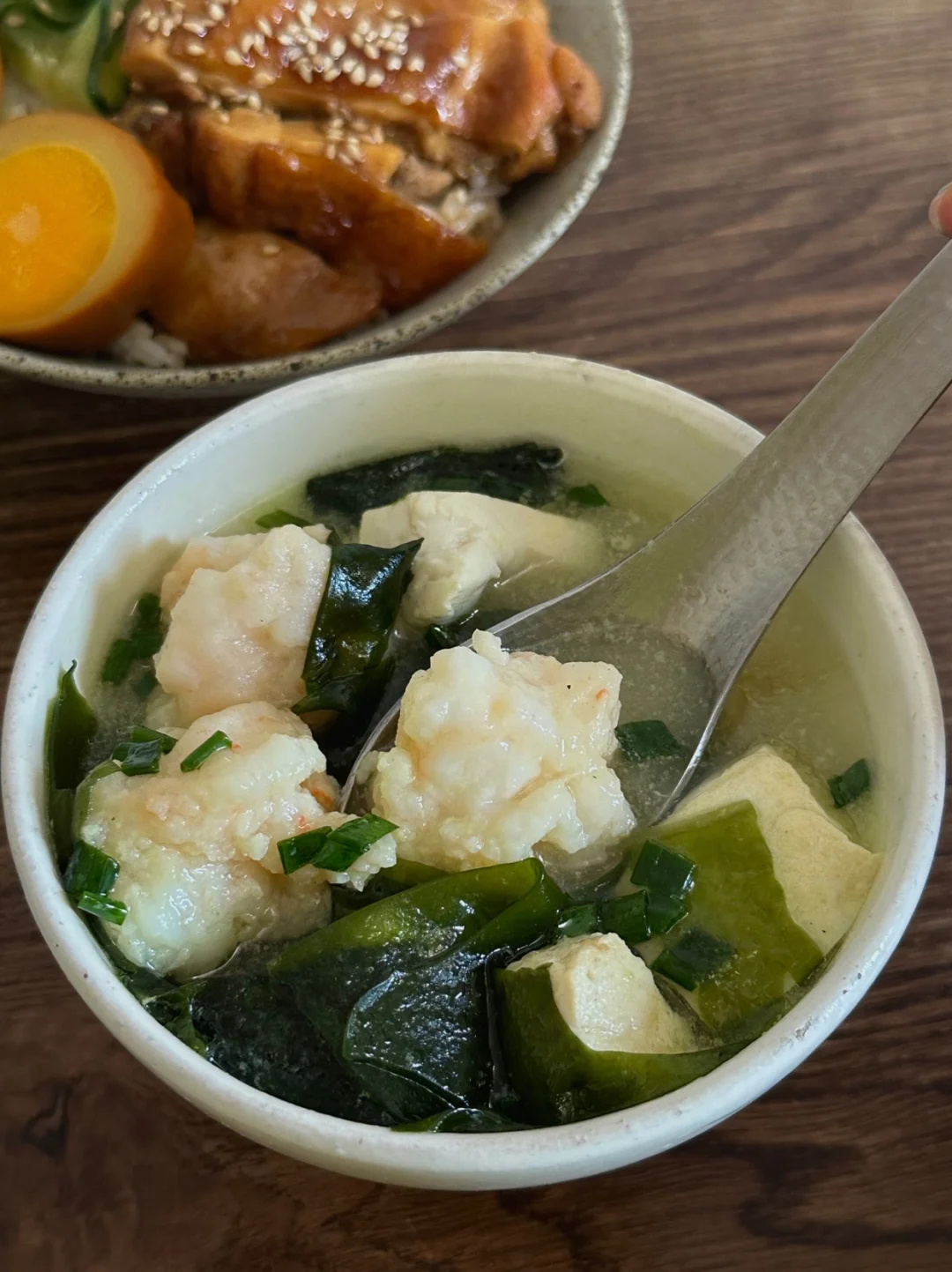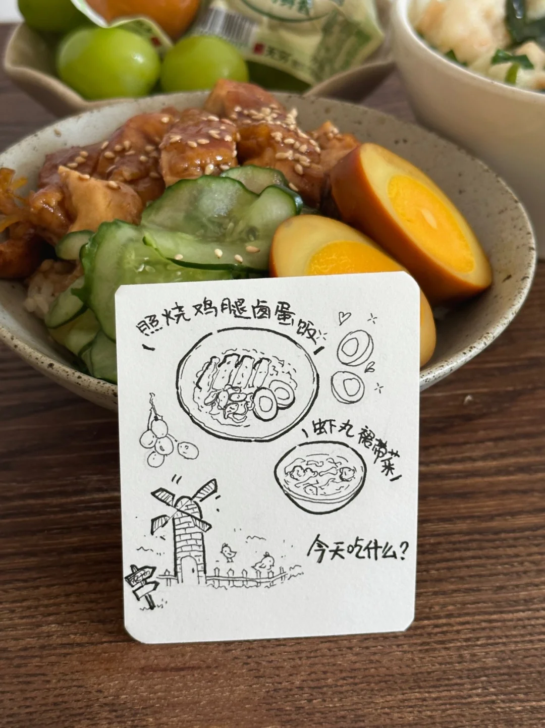 今日午餐:蜜汁鸡排卤蛋饭,裙带菜虾滑汤,提子