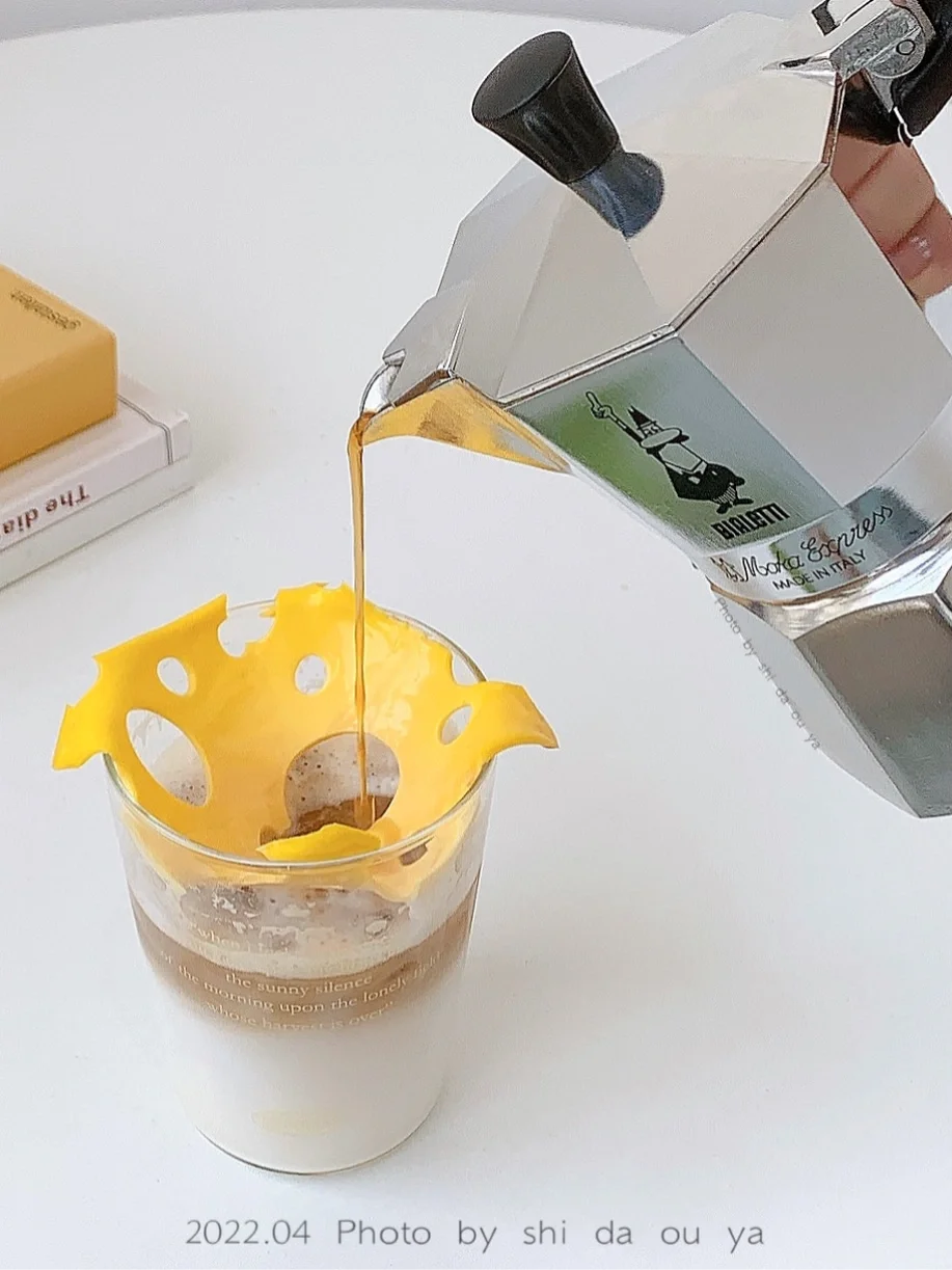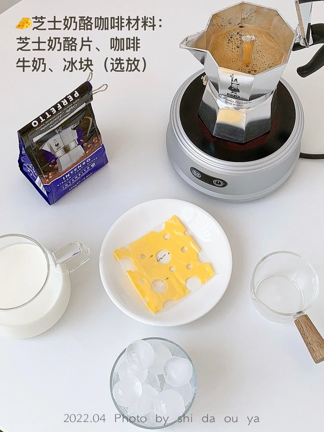 杯中依次放入:冰块➕牛奶➕奶酪片➕咖啡