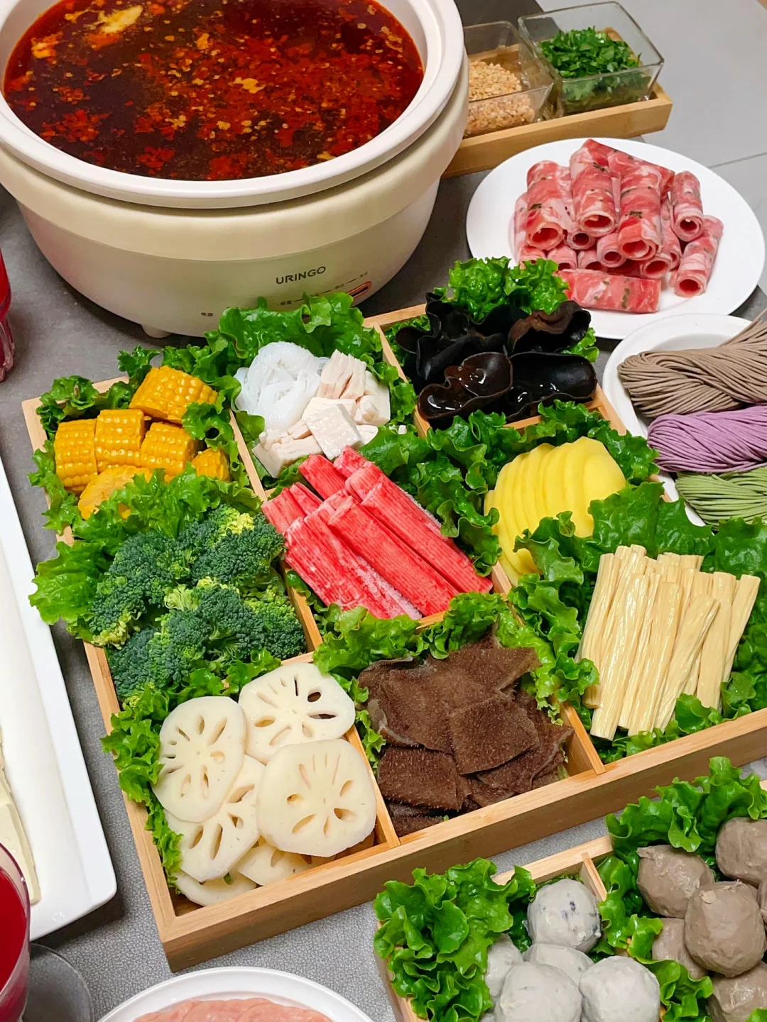 🍲九宫格拼盘:毛肚、蟹棒、魔芋丝&魔芋豆腐、土豆片、藕片、腐竹、玉米、木耳、西兰花