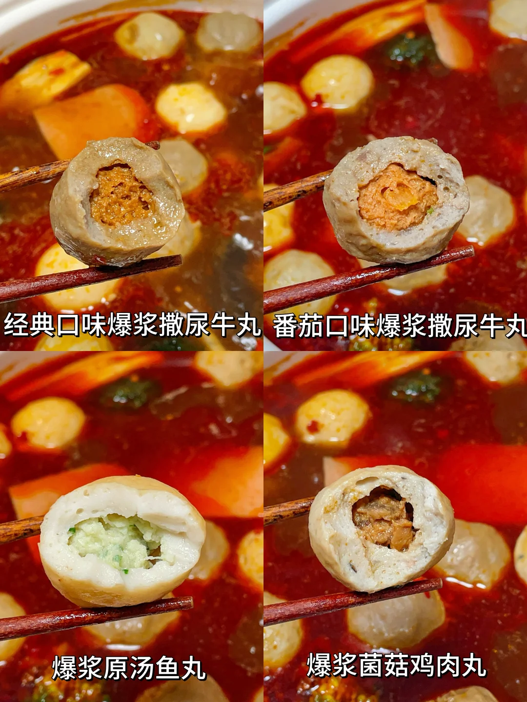 🍡丸子四宫格:三全火锅丸子家族——爆浆撒尿牛丸、爆浆原汤鱼丸、爆浆菌菇鸡肉丸