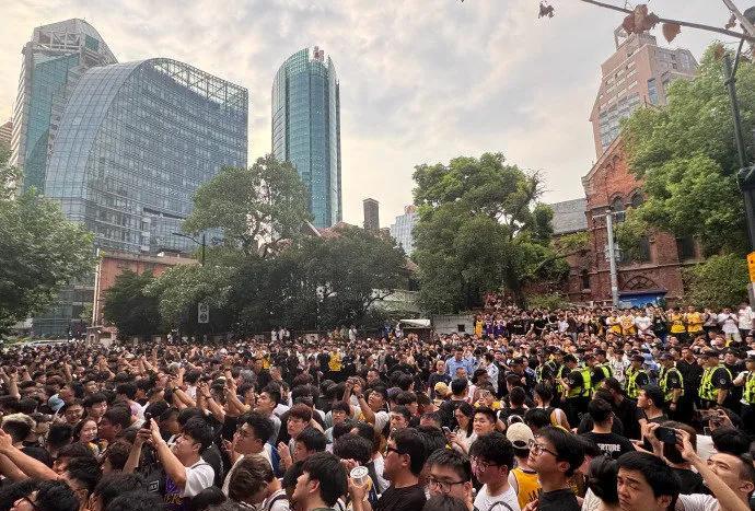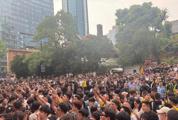 詹姆斯上海站活动今晚开启,场外球迷越聚越多,大家举着应援物、翘首以盼,目光紧紧锁