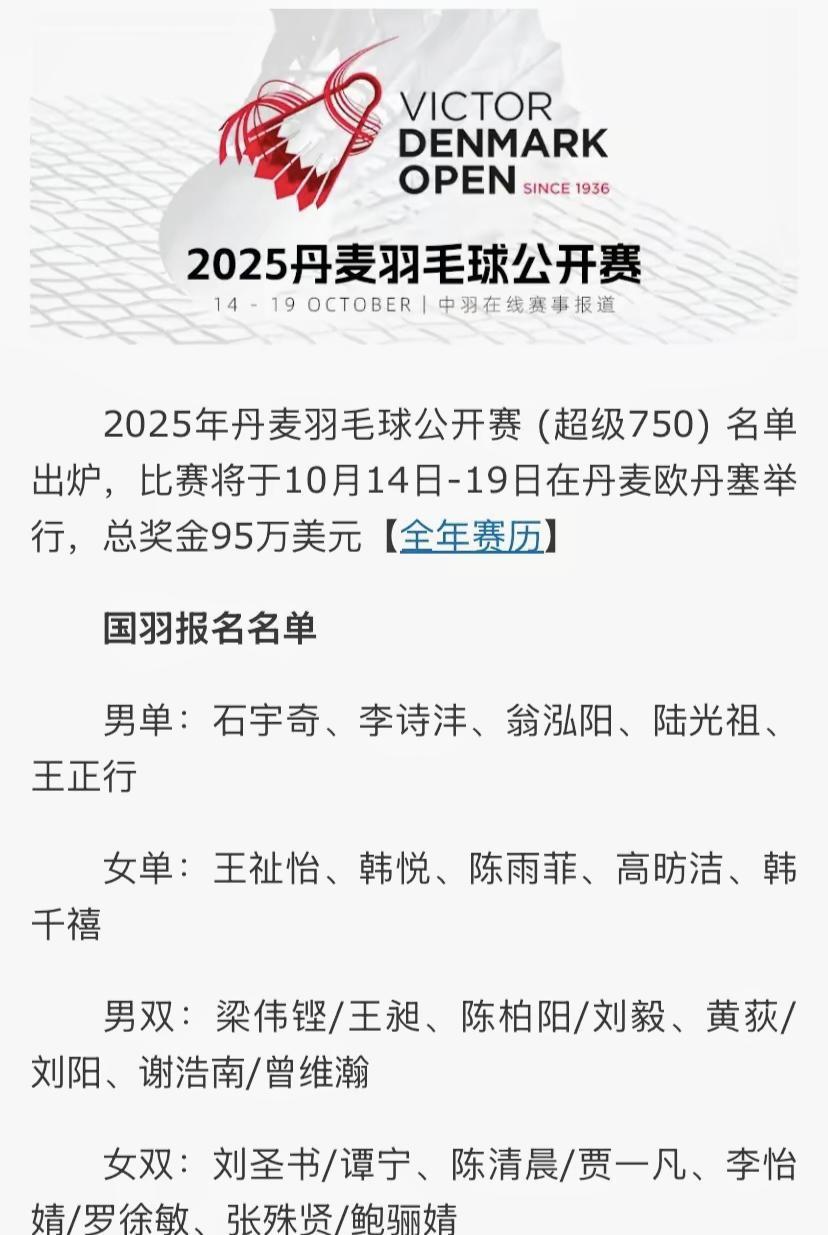 凡晨组合真的又重新合体了? 国羽刚刚公布了丹麦羽毛球公开赛国羽参赛名单,因为是年