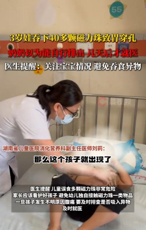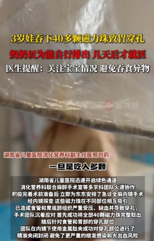 “心太大了!”2025年8月,湖南,一名3岁小男孩误把磁力珠当做糖果,整整吞下40颗,而奶奶竟以为孩子只吃下一颗,几天后能自行排出,就没管!不曾想,3天过去,孩子却因此导致胃穿孔!网友:真是吓人啊! 这段时间,天气还挺热,不少人家都开着空调,让屋里能凉快些,这孩子年纪小,正是对啥都好奇的时候,看到啥都想往嘴里放,那天家里没人盯紧他,他瞧见桌上放着一盒子磁力珠。 那珠子圆溜溜、亮晶晶的,看着跟糖果似的,孩子哪儿分得清,伸手就抓了一把,一颗接一颗往嘴里咽,不知不觉竟吞下了40颗,后来奶奶发现孩子嘴里好像在嚼东西,追问之下,孩子说吃了“糖”。 奶奶一看是磁力珠,赶紧问吃了几颗,孩子小表达不清楚,还以为只吃了一颗,奶奶想着,就一颗小珠子,说不定过几天能自己排出来,也没太当回事,既没带孩子去医院,也没多留意孩子的情况。 可过了3天,孩子开始不对劲了,他总捂着肚子,一脸难受的模样,还时不时哭闹着说疼,刚好这天孩子爸爸下班回家,看到儿子这副样子,赶紧追问情况,孩子这才又说起吃磁力珠的事儿。 爸爸一听心里咯噔一下,赶紧抱着孩子往医院跑,到了医院,医生给孩子做了检查,结果一出来,全家人都吓傻了,孩子肚子里根本不是一颗磁力珠,而是整整40颗! 更严重的是,这些珠子在肚子成了一团,已经把孩子的胃给弄穿孔了,情况特别危险,医生没敢耽误,立刻安排手术,好在手术很顺利,磁力珠全都从孩子肚子里取了出来。 孩子术后慢慢恢复,总算是脱离了危险,这事儿传到网上后,很多人都说奶奶太心大,孩子出了这事儿,可不能抱有侥幸心理,得第一时间送医院,不然耽误了病情,后果可就严重了。 信息来源:《3岁孩子吞下40多颗磁力珠,奶奶以为能自行排出,几天后才就医发现胃穿孔》潇湘晨报