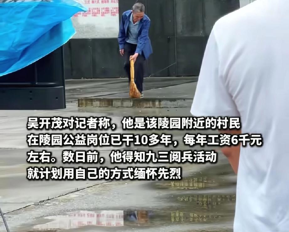 求路人调试,在陵园用电视播放阅兵的老人叫吴开茂,69岁高龄的他干此公益十余年,每月只几百元微薄补贴。那天他在路口站了很久,当小伙随他走到电视机旁时,老人一句话让所有网友瞬间泪目! 事情发生在9月3日的陕西安康岚皋县烈士陵园,从户外环境看,这里青山环抱、十分幽静,夜雨洗礼后,整个陵园素雅整洁。 这一天上午要阅兵,为了让英雄烈士们看到祖国的繁荣强大、英灵永安,老人在前一天就从亲戚家借来了大电视,想陪这群看不见的英雄,共同度过这一伟大时刻。 电视摆放在陵园广场中间,屏幕正对着纪念碑,他前一天就让人将电视调试好,这满满的细节,体现了用心和尊重。 然而现在的电视不像过去,一打开就能播放,等到老人第二天早上过来,电视又需要重新进行调控。 整不明白的吴开茂只能去路边等待,希望有年轻人开车路过,自己拦车求助帮忙。陵园位置比较偏僻,山路弯弯平时也没什么人,他一等就是好几个小时,这一点从电视调试成功后,阅兵已经进行到方队经过可以看出。 当小伙开车随老人来到空荡荡的陵园后,眼见周围无人,他忍不住问了一句: “在这里放电视,给哪个看呢?” 只见老人哽咽了一下,伸左手指了指刻着“革命烈士永垂不朽”的纪念碑,沉重地说道: “给……,给他们看!” 是啊,无数革命先烈抛头颅、洒热血,一代代先贤不懈努力,才有如今繁荣富强安定的中国。这盛世壮景,我们震撼,他们也更加想亲眼看到。 有一句歌词写得特别好:如果说你曾苦过我的甜,我愿活成你的愿。 祖辈父辈承受战争与贫困的苦难,换取子孙后辈和平富足的甜美,后辈承担延续父辈理想,用奋斗让国家更加强大。在老人打开电视,给烈士英灵播放阅兵式的那一刻,一切都具象化了! 也难怪网友们会鼻子发酸、双目微红。 69岁本该是含饴弄孙、安享晚年的时候,老人却在烈士陵园坚守,他在此公益岗位已经干了十多年,每年补贴也就6000元左右,一个月仅500元。 整个烈士陵园十分干净整洁,在调好电视播放阅兵时,老人并没有闲着,而是去清理纪念碑上的各处积水,细心细腻且温柔。 在他眼里,那里不是冰冷的文字和无言的石块,是革命烈士、前辈先哲,英灵永驻不应该被遗忘,他们在冥冥中也能够感受到一切。 吃水不忘挖井人,祖国的今天已今非昔比!革命前辈们,这盛世如你们所愿…… 【关注@小讼言案 ,为您分享更多精彩】 (来源:人民日报)