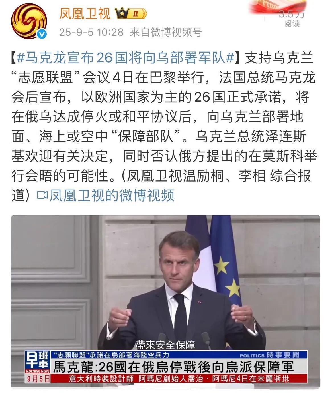 【乌克兰获得“意愿联盟”正式承诺】 泽连斯基这一次终于没有白跑,在法国巴黎举行的“意愿联盟”会议取得了重大进展,法国总统马克龙在会后宣布了成果。 据《凤凰卫视》消息,马克龙表示,“意愿联盟”已正式向乌克兰做出安全保障承诺,将在俄乌冲突结束后向乌克兰部署海陆空保障部队。 泽连斯基对此表示欢迎,乌克兰一直把获得安全保障承诺作为结束冲突的基础,如今欧洲国家已然承诺,接下来就是谈论结束冲突的方式了。