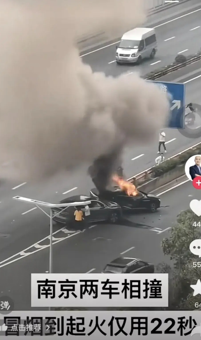 9月4日,南京两车新能源撞击后撞向居中水泥护栏,从视频纪录看到电车从冒烟到起火仅22秒,