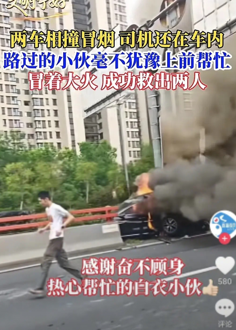南京两电车相撞,冒烟到起火仅22秒,起火车司机被路过小伙相救!