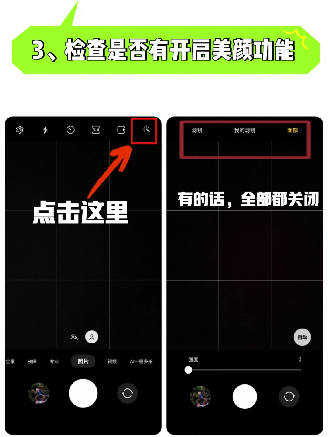 3️⃣回到相机自拍页面,点击右上角小铅笔图标,进去把滤镜,还有磨皮这些功能通通关闭,有时默认会开启美颜设置,不关闭拍出来的照片磨皮很重,看着很不自然