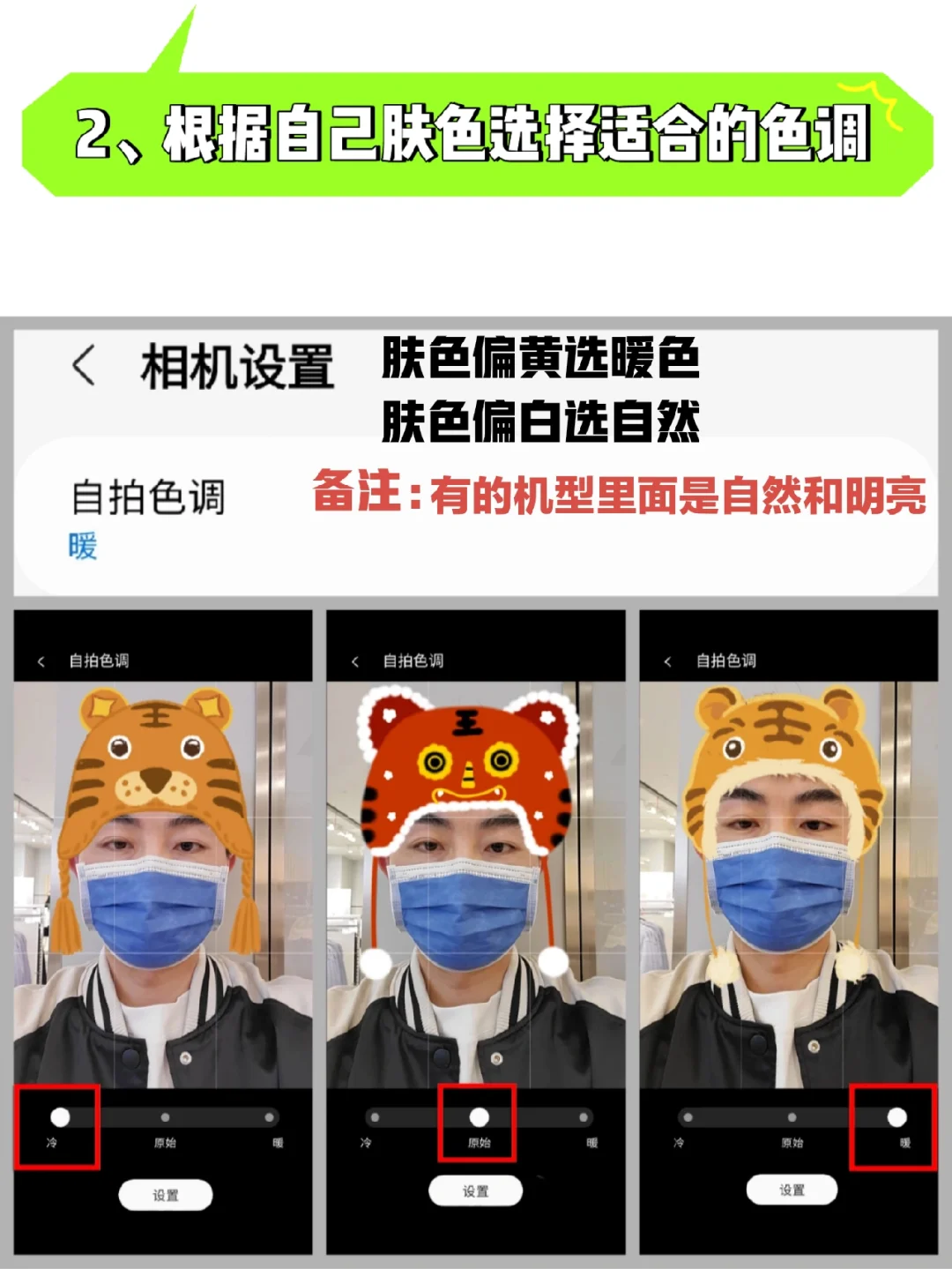 2️⃣自拍色调这个功能一定要调整,因每个人肤色不同,一定要根据自己肤色选择适合自己的肤色色调,这样拍出来的照片既清晰又自然