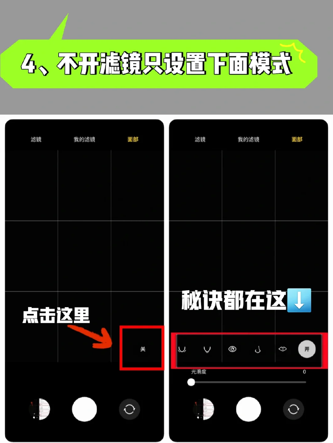 4️⃣教大家如何正确使用相机自带美颜功能,切记不要开任何滤镜,根据前面三步全部设置好之后,打开相机右上角美颜功能选择面部,点击自动功能,比如什么V脸、大眼等等,结合自己审美标准随意调整,随便一拍都是美照,重点是很自然不像P的