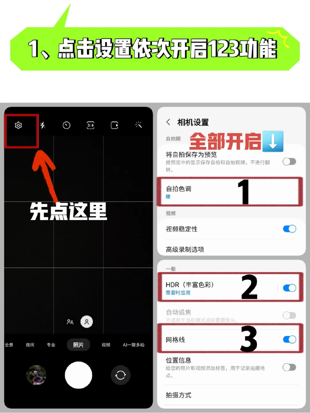 1️⃣打开三星手机相机切换为前置拍摄,点击左上角设置,依次开启图1中的功能(每一步都很重要)尤其第二步
