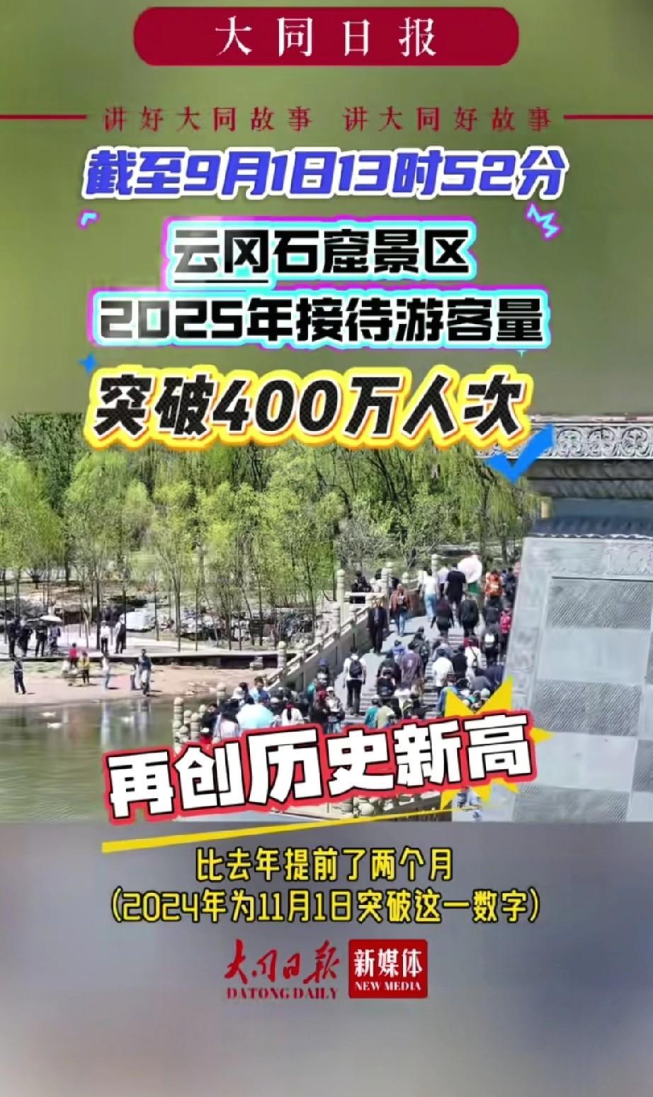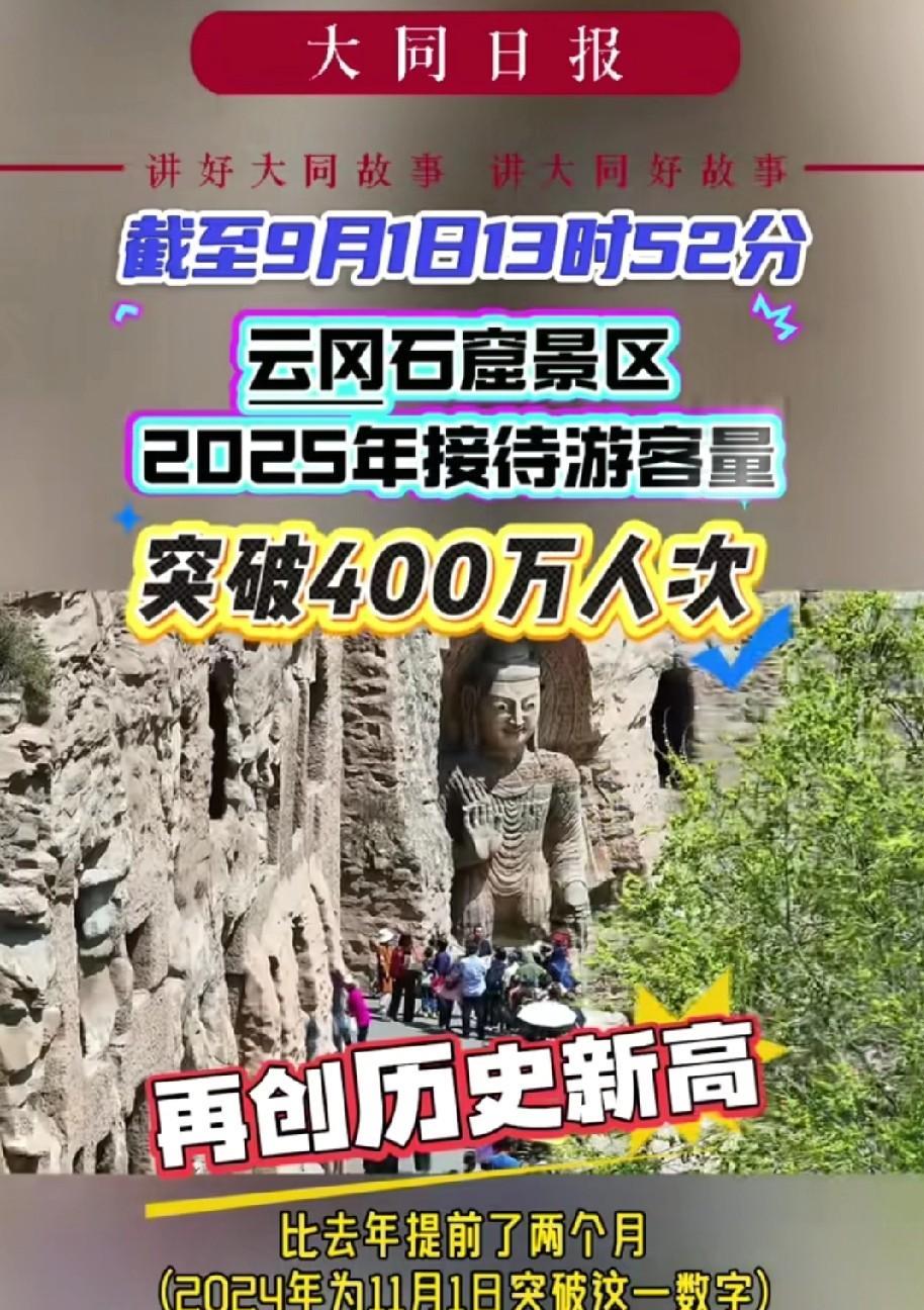 又一次创造历史了。截至9月1号云冈石窟风景区2025年接待游客量突破400万人次