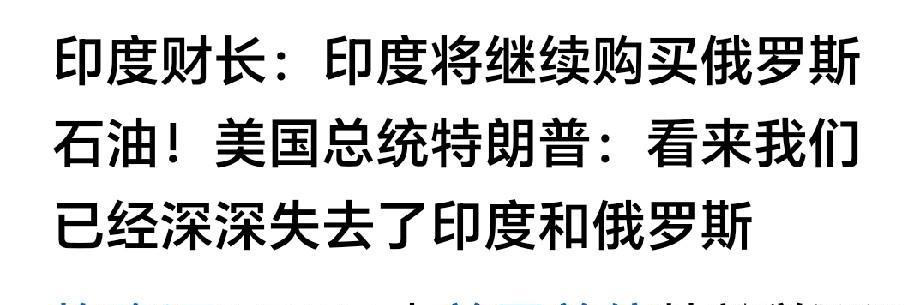特朗普敢继续制裁由上合成员国加持下的印度吗?印度财长:“不惧怕美国的制裁和威胁,将继续购买俄罗斯石油能源”。印度财长说此话的意思是不是可以理解为,莫迪在中国上合峰会上顺风顺雨的配合峰会的各项议题圆满完成,是为了能在上个组织内部获得了某种程度上的许诺?让印度更有底气来应对特朗普的霸凌式恶意惩罚? 特朗普说:看来我们失去了印度和俄罗斯。如特朗普所说美国失去印度和俄罗斯是不是意味着特将要加大力度惩罚印度和俄罗斯呢?但是美国已经对俄罗斯采取最严厉的制裁,俄美贸易几乎停滞。那么特朗普会对印度或者说特朗普敢向对俄罗斯那样大规模惩罚印度吗?相信特朗普不会他也不敢采取对付俄罗斯的手段来对付印度。特朗普应该知道,一旦他采取加大对印度的不理性惩罚关税的话,印度绝对全身心的选择完全倒向中俄两个,那样的话中俄印三角关系外加上合金砖两大组织,绝对可以压制由美国领衔的西方列强对世界政治舞台的肆无忌惮。得不偿失的事特朗普不会不去考虑的。