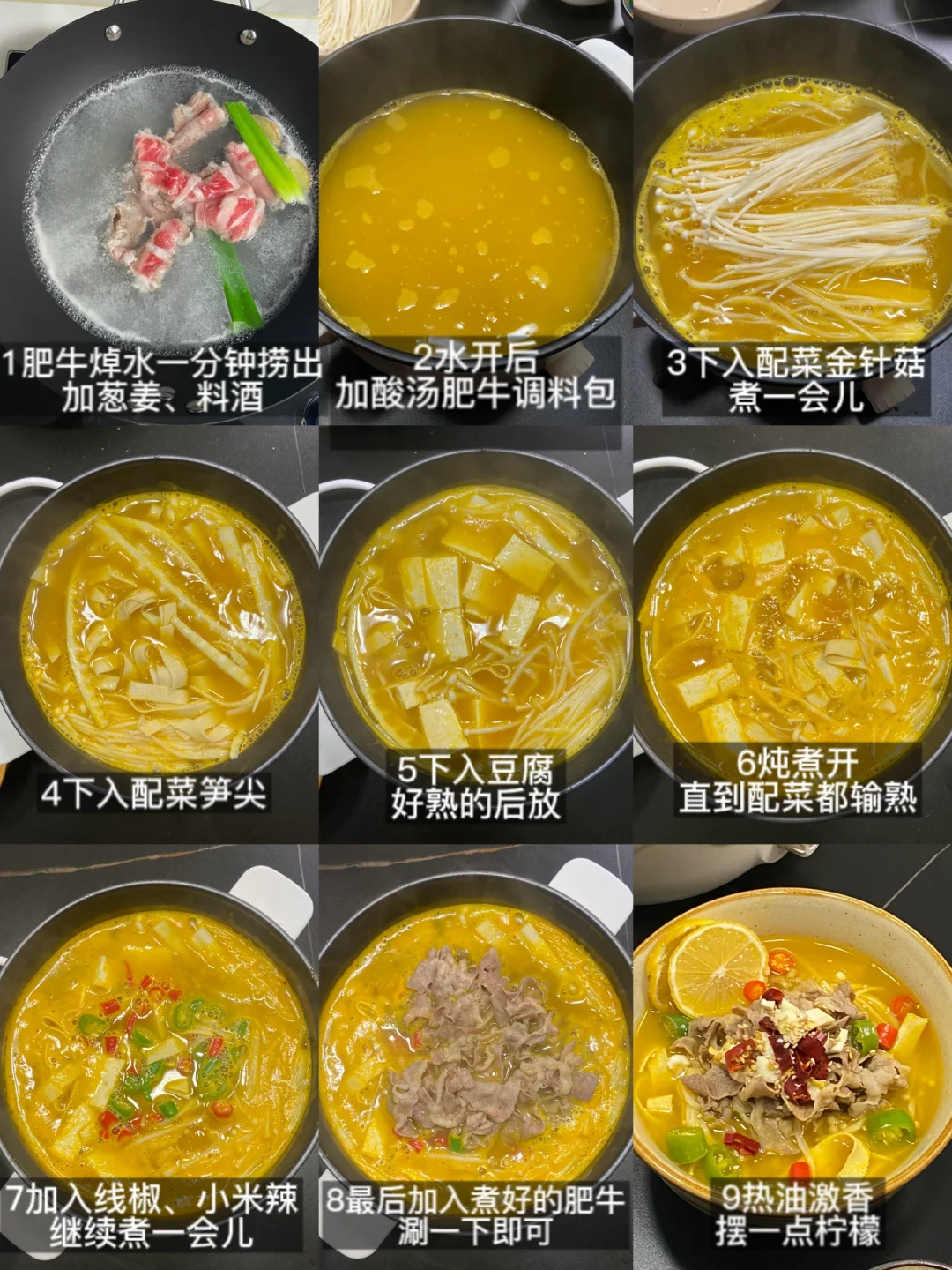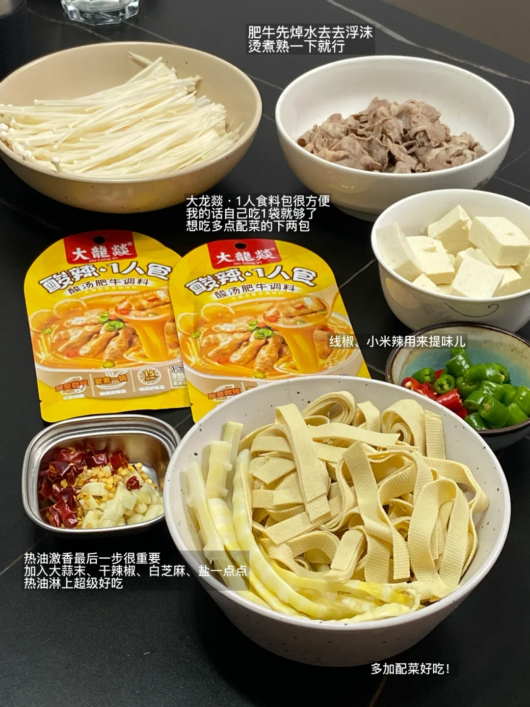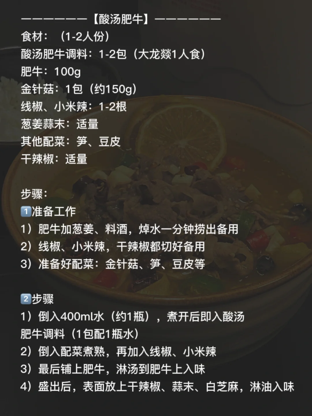 菜谱在p6 酸汤肥牛做法超级简单!类似于煮火锅类型的,拿一包酸汤肥牛料包,我用的大龙燚的一人份料包很方便,不过想多吃点配菜可以煮两包,一个锅煮着就可以完成 tips: 1⃣️最后一步淋油激出香味很灵魂!好喜欢蒜香和干辣椒一起的香味!