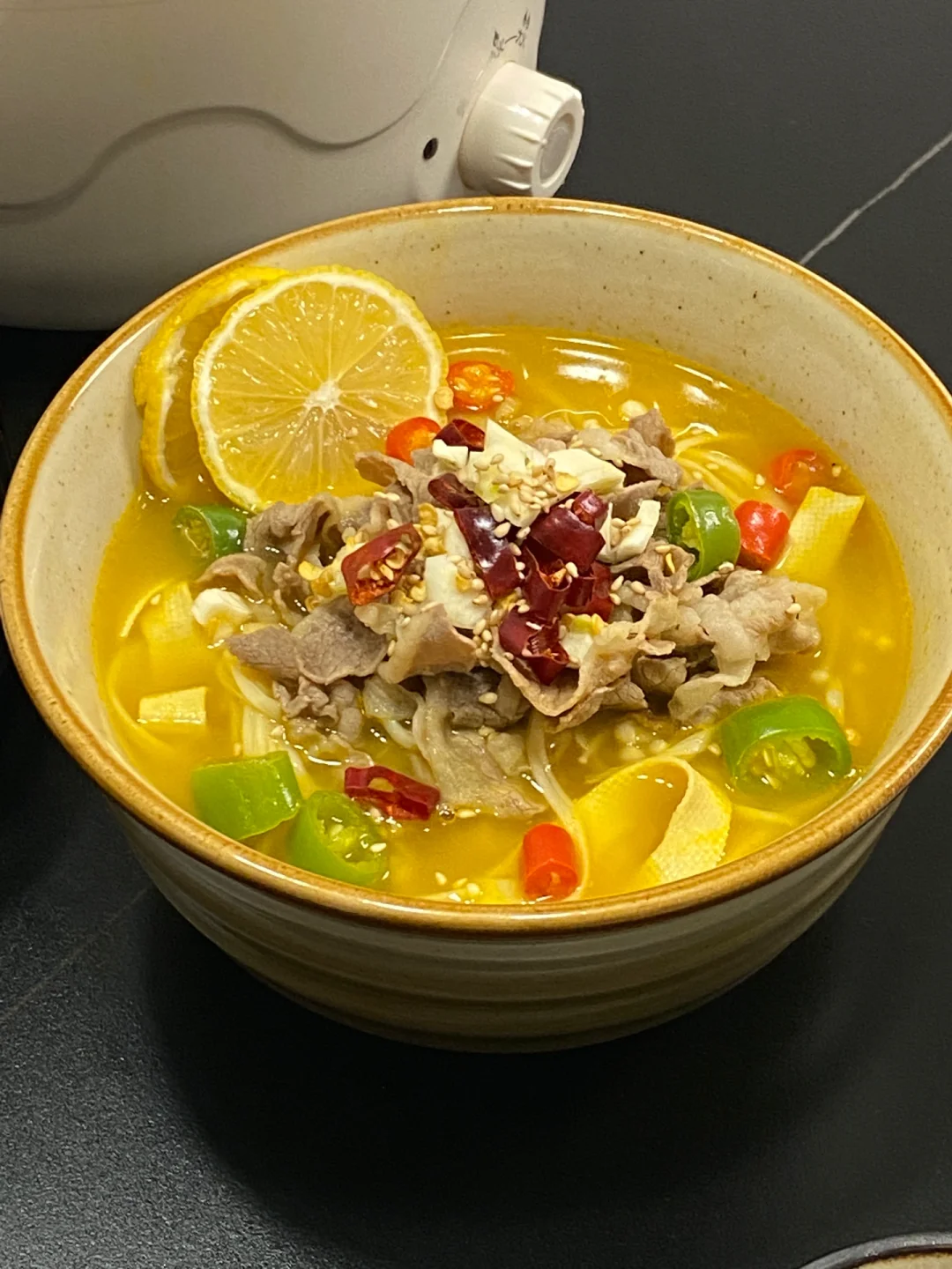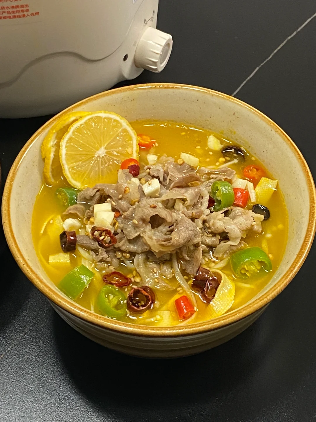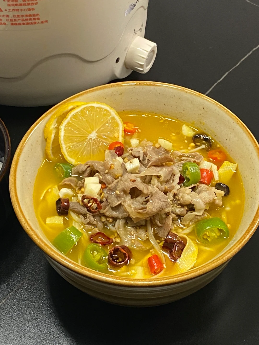 菜谱在p6 酸汤肥牛做法超级简单!类似于煮火锅类型的,拿一包酸汤肥牛料包,我用的大龙燚的一人份料包很方便,不过想多吃点配菜可以煮两包,一个锅煮着就可以完成 tips: 1⃣️最后一步淋油激出香味很灵魂!好喜欢蒜香和干辣椒一起的香味!
