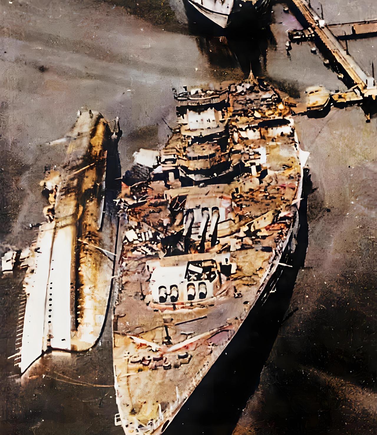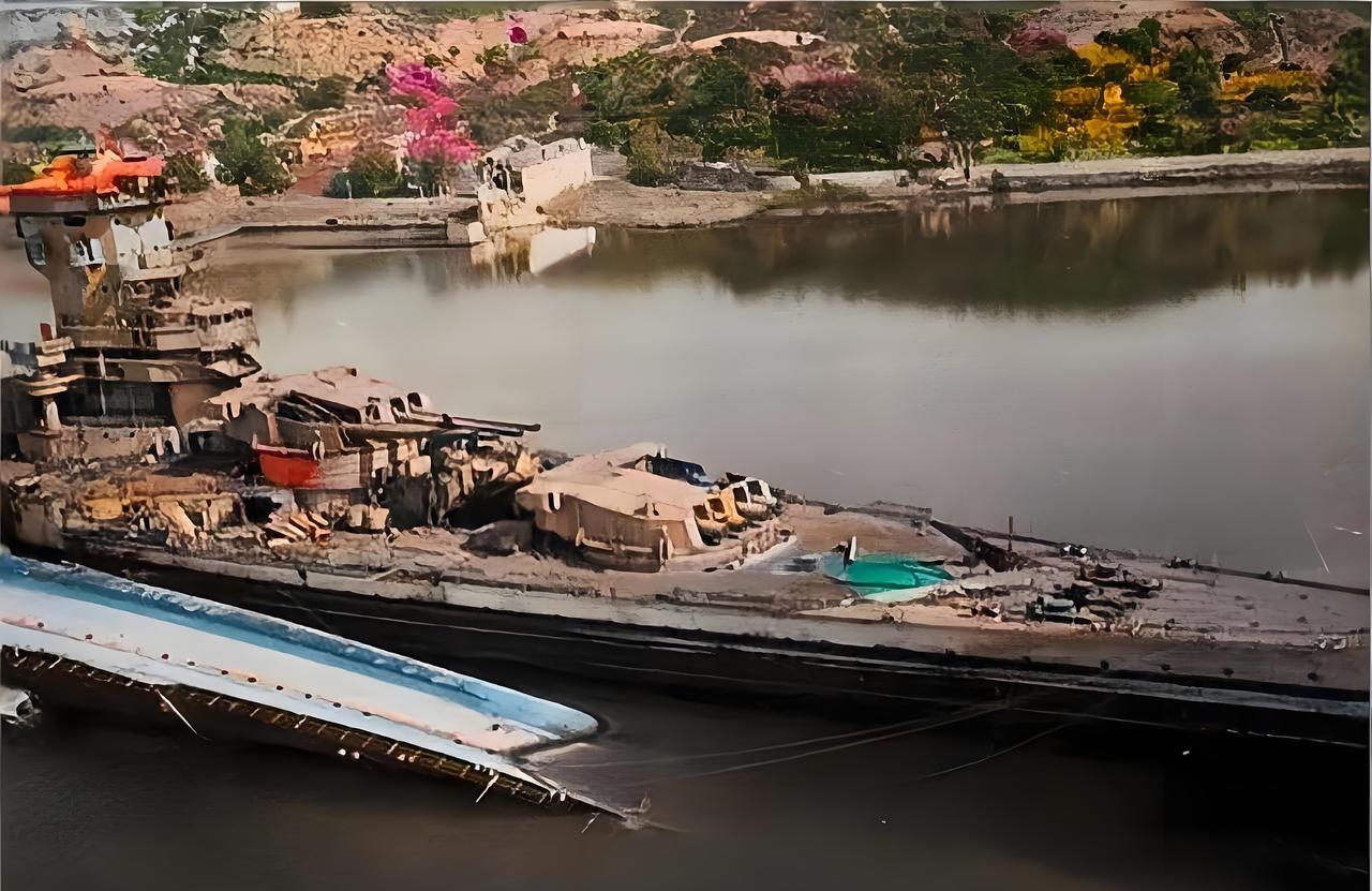被炸成废铁的法国战列舰 二战时期的1944年,在法国土伦港,照片上锈迹斑斑、惨不