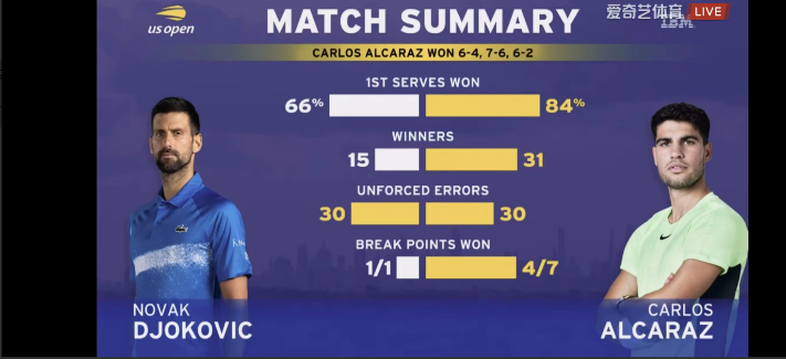 新老天王对决,终究还是没能出现奇迹!阿尔卡拉斯用3:0的比分,结束了德约科维奇的美网之旅。这场半决赛没有败者,38岁的德约科维奇永远是一个传奇,如果真的要说他输了的话,他只是输给了时间,输给了岁月。毕竟,在他漫长的美网生涯中,1/4决赛还没有人可以战胜他,这是一个多么了不起的成就!