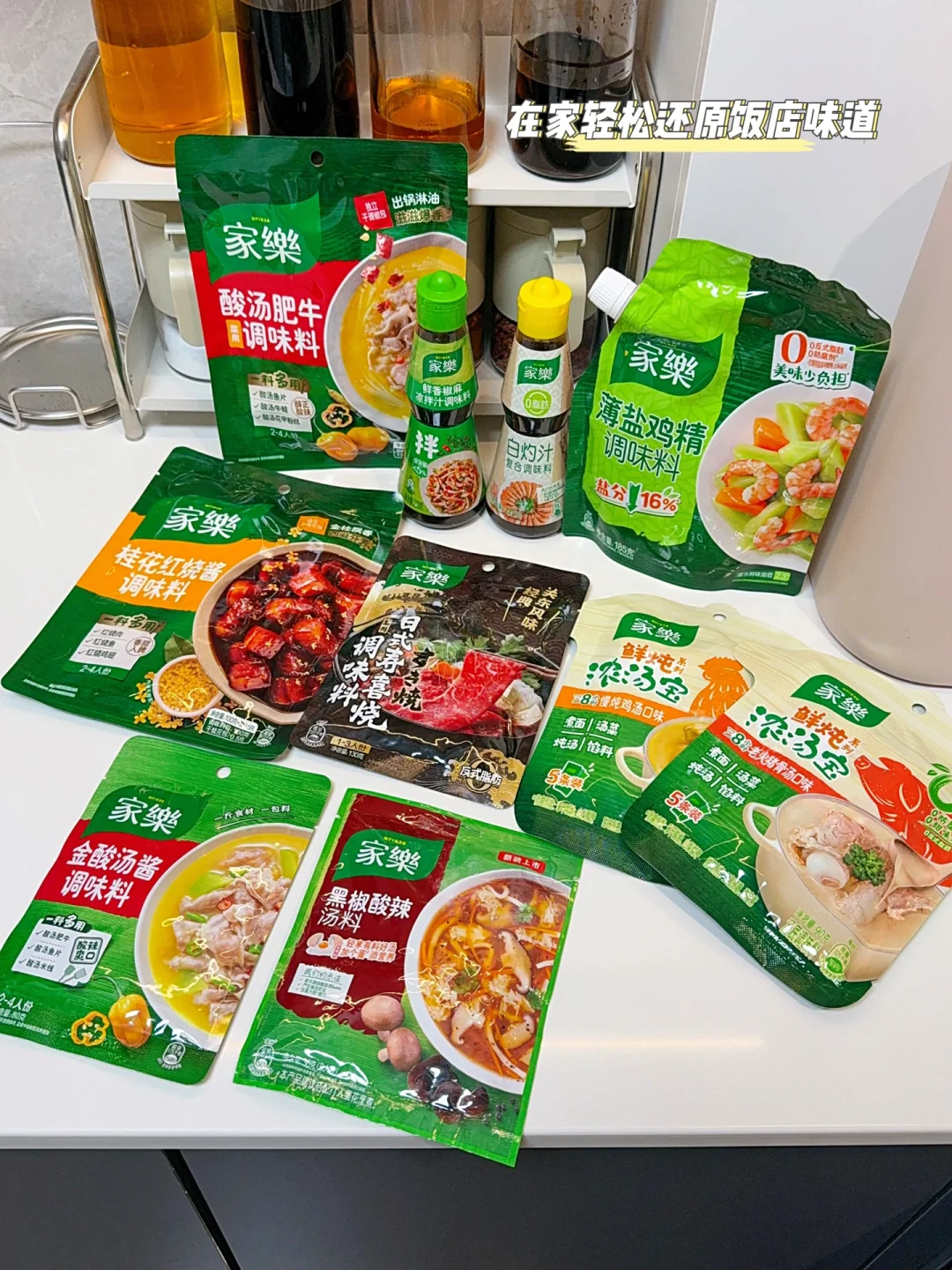 [向右R] 我常用的就是家乐酸汤肥牛酱和家乐桂花红烧酱。5分钟做出餐厅同款酸汤肥牛带回家, 正宗的酸汤味道鲜酸爽口,做起来的简单程度就是“只要会烧开水就会做”[笑哭R]桂花红烧酱做吃的菜酱色红润,口味清新鲜甜,不用花时间和心思炒糖色,还有独立的干桂花包,让菜品直接达到饭店仪式感[赞R][赞R]
