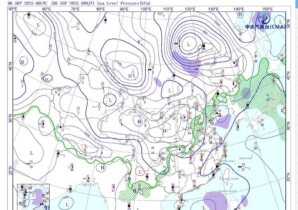 从今天的天气图实况来看,今天副热带高压依然是强势,而且西边还有陆地高压的影响。