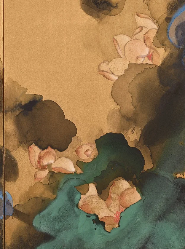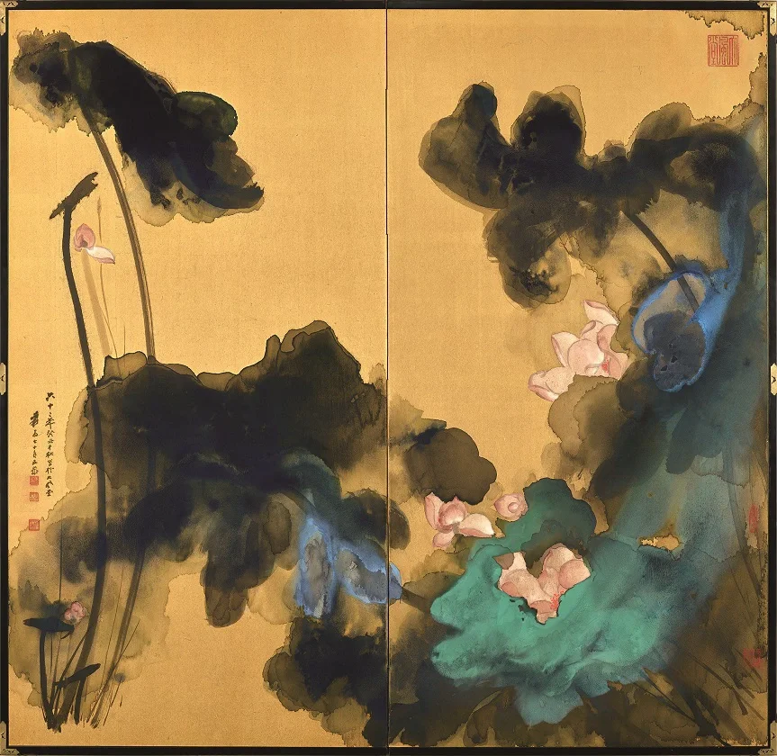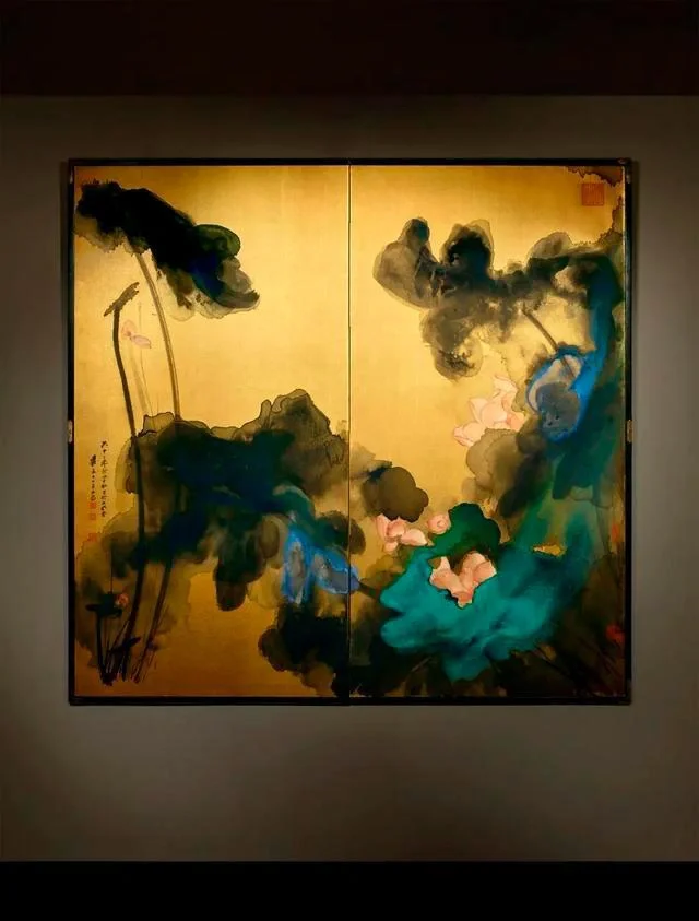 女儿出嫁时,为父的张大千都亲手绘画屏风作嫁妆,可见屏风多珍贵,即将拍卖的《泼彩荷花屏风》,是收藏界知道仅仅五张张大千笔下大型屏风之一 ,而且全个以日本金箔制作,世上罕见,「屏风这么少,是因为他在特殊日子才会写。此屏风在日本订制,上面铺满金箔,存世好少。金屏风本身已价值不菲,它的运输成本也高,绘制在1973年,当时大千住在美国环筚庵,屏风上有『环筚庵』印章。全张画好后再运到香港。」大千一生钟爱荷花,屏风上以泼彩技法绘制了荷花,但屏风铺金箔,不似纸墨,「纸能吸墨,但金箔不吸墨,因此会有笔墨流动的痕迹,不像生宣,它很易画坏。墨韵半透明,营造了风吹带动叶动,光影变化,这是一层一层的渲染的效果。」此屏风高达六呎,比只有五呎许的张大千还要高。完成后他除了在画上盖上「环筚庵」一印外还再盖上「得心应手」一章,可见是大师满意之作。当年香港的藏家陆菊森伉俪得知大千画好此作,透过在香港的代理李祖莱购入,把它运到香港,一直收藏至今。如此罕有,《花开十丈影参差》估价超越二亿,有可能再破拍卖纪录。