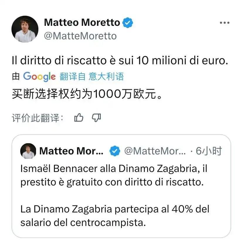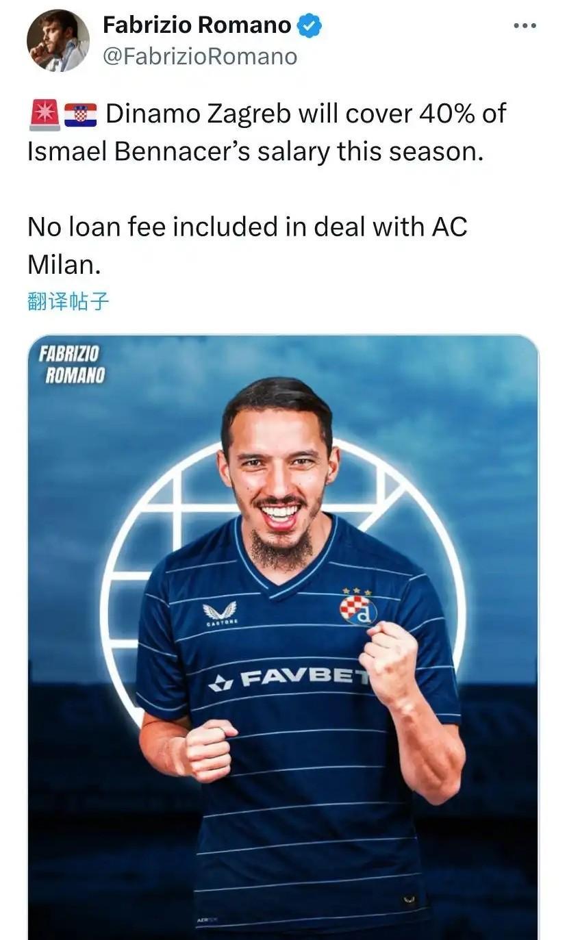 交易完成!终于完成了!本纳赛尔总算是离开了,两个月的煎熬,总算盼来结果了。不用想着明年买断了,肯定白嫖,明年合同年,还得闹的鸡飞狗跳,但这个租借还是满意的,比租借给马赛俱乐部要好,明年请本纳赛尔继续与米兰管理层斗智斗勇,继续加盟心心念念的马赛俱乐部, 本纳塞尔以零租借加约1000万欧元选买加盟萨格勒布迪纳摩,同时,萨格勒布迪纳摩将承担这位中场40%的薪水,与米兰的交易中不包含租借费。我昨天翻译错误,没读懂,以为是米兰负担40%,原来是米兰承担60%,能接受,零租借费也能接受,走了就好,不是不喜欢本纳赛尔,而是因为本纳赛尔留下米兰需要承担100%,一分钱也没有人帮助承担,现在算是很好的结果了。 去年沙特报3000万欧元,死活不愿意,伊布拉希莫维奇说本纳赛尔就是最好的引援,一群人在伊布拉希莫维奇个人主页留言,伊布拉希莫维奇就是装看不到,然后马上伤大半年,伤好了就去马赛俱乐部了,还在马赛写小作文,看在他是老臣的份儿上忍了他了,今年沙特又报2000万欧元,还是不肯走,还是要去马赛俱乐部,这次米兰俱乐部算是做了正确的选择,真的去了马赛俱乐部,就是米兰的耻辱交易。