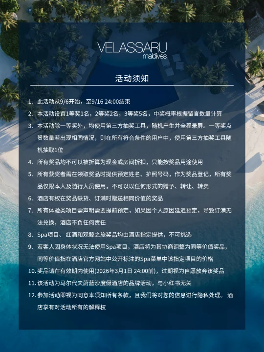 十一黄金周,不妨给自己一个享受奢华假期的理由! 关注马尔代夫蔚蓝沙度假酒店的账号,点赞、收藏、在评论中分享你和海洋的奇妙故事,将有机会获得: 🎁 一等奖(1名):点赞最多 - 双人Spa体验 🎁 二等奖(2名):随机抽取 - 一瓶红酒 🎁 三等奖(5名):随机抽取 - 观鲸之旅 活动时间:9月6日–9月16日 幸运名单将在9月19日公布,快让你的十一假期更精彩吧!