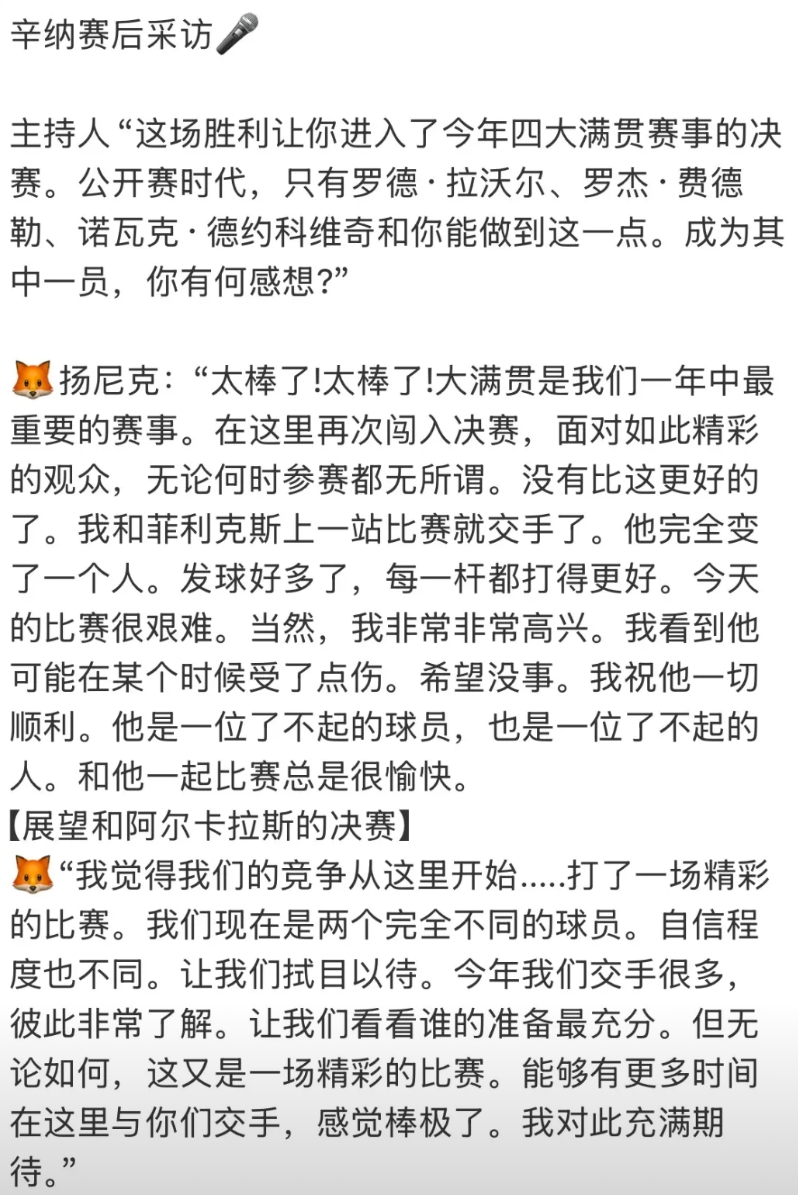 辛纳赛后采访来了:我和阿卡彼此非常了解!