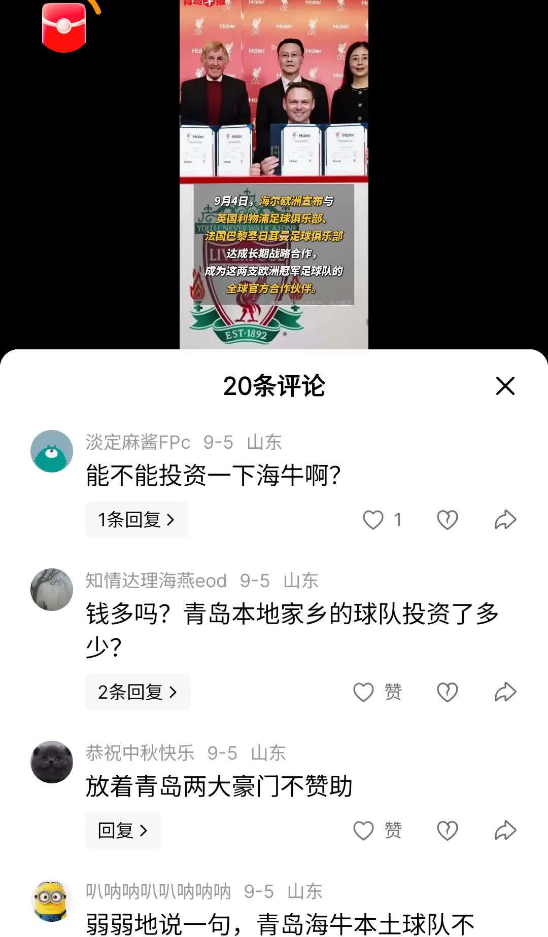 青岛海尔今天宣布每年几个亿支持利物浦和大巴黎,青岛海信更是每年十来个亿支持欧洲杯