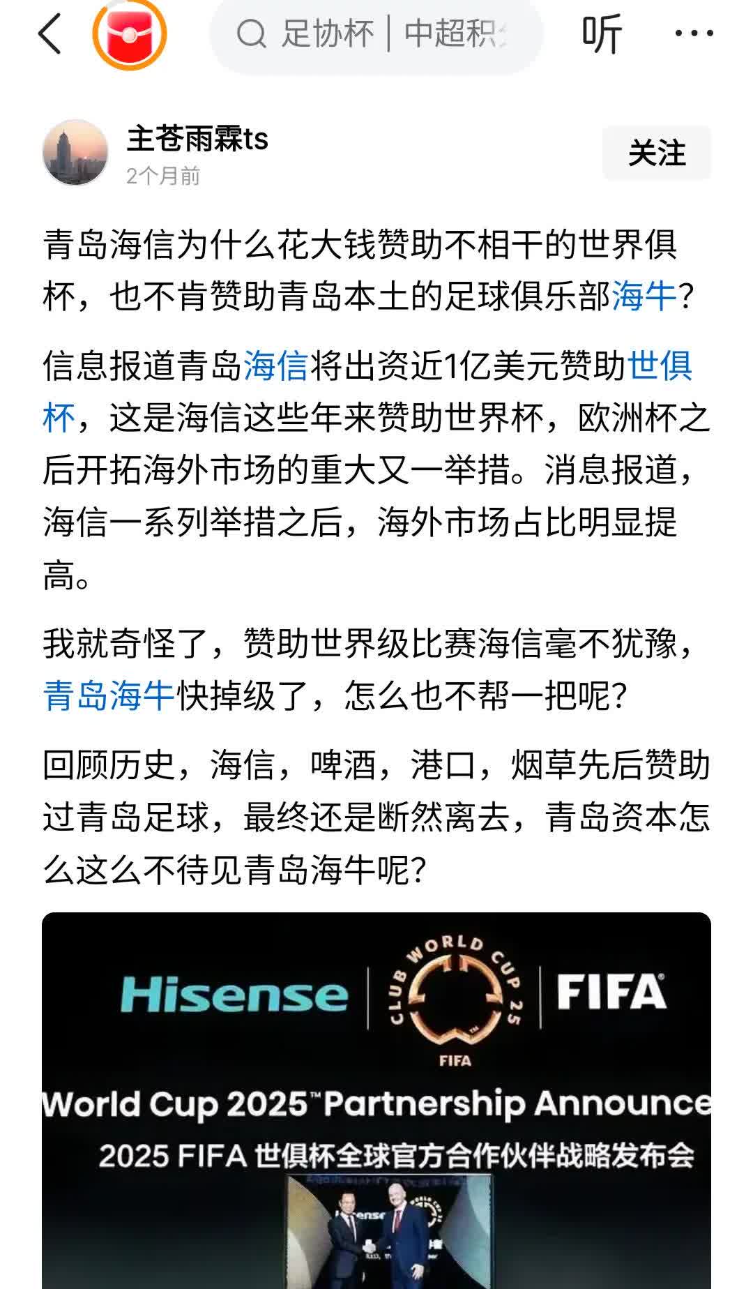 青岛海尔今天宣布每年几个亿支持利物浦和大巴黎,青岛海信更是每年十来个亿支持欧洲杯和世界杯以及奥运会的TOP,好多球迷问为什么这两个企业确一点都不支持青岛的两只中超球队?甚至前几年中甲的青岛黄海都马上要冲超了,愣是没找到钱而退出了。 其实球迷看中超也就看个热闹,里面的事根本都不知道。 我觉得中国国内好多大企业不支持中国足球是因为他们都知道中国足球这潭浑水太深,他们都不愿意蹚。赞助中国足球钱花了说不定还惹一身骚,让自己品牌得到负面影响。 中国足球环境如果不改变的话,是没有未来的!玩足球最重要的是一个公平,真实,就是中国足球最欠缺的! 我话放这,除非有意外(国际足联给中国外卡之类)国足2030年世界杯还是进不了! 如果中国足球从今年开始能改,最少也要到2042年才能进世界杯。如果现在不改,那估计得2050年了!