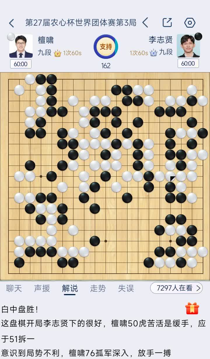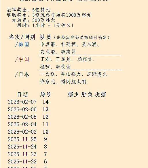 今天9.5日下午2:30分,第27届农心杯三国围棋擂台赛第三局开赛: 李志贤执黑棋守擂——檀啸。 到下午4:27分左右,檀啸执白棋第162手,李志贤见无力回天,遂投子认输,檀啸中盘胜。 明天下午2:30分第四局开赛: 檀啸守擂——许家元(日队)。 农心杯是半快棋,各用时1小时,1次1分钟。黑贴6.5目。冠军队奖金5亿韩元。 2025.9.5日草于滨城大连。