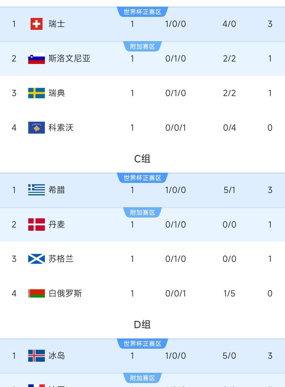 欧洲世预赛一夜五队狂飙! 意大利、冰岛和希腊轰五球! 瑞士和以色列双双4-0大胜! 【B组】 瑞士4-0科索沃,四球全是上半场打进,阿坎吉首开纪录,恩博洛独中两元,后程胜券在握,球队是提前鸣金收兵。 瑞典2-2斯洛文尼亚,两度领先都未能守住,最终惨遭90分钟绝平。 【C组】 希腊5-1白俄罗斯,上半场火力全开飚进四球,全场30次射门,其中15次射正。 丹麦0-0苏格兰,两队情况较为类似,锋无力,因此90分钟鏖战绝对威胁屈指可数。 【D组】 冰岛5-0阿塞拜疆,前程较为沉寂,直到上半场补时帕尔松打破僵局,随即球队进攻端迎来爆发,下半场回来短短二十分钟连进四球,迎来一场酣畅淋漓的大胜,他们暂时力压法国位列头名。 法国2-0乌克兰,第10分钟奥利塞推进首开纪录,开局美妙,但接着遭遇长时间的僵局,一度险些被扳平,还好是有惊无险,最后第82分钟姆巴佩上演转换一条龙锁定胜局。 【I组】 意大利5-0爱沙尼亚,上半场的表现让球迷是咬牙切齿,众多机会却一次都无法把握,本来都已经是特别失望,结果下半场又支棱起来,第58分钟小基恩头球破门,球队正式迎来爆发,雷特吉双响,拉斯帕多里和巴斯托尼相继建功。 以色列4-0摩尔多瓦,上下半场各入两球,他们多赛一场暂时小组第2。 【L组】 克罗地亚1-0法罗群岛,克拉马里奇第31分钟打进制胜球。面对世界排名第141位的弱旅,克罗地亚如此表现肯定难让人满意,进攻着实踢得差劲,中场缺乏创造力,而锋线没有速度,完全无法突破防线。 捷克2-0黑山,4胜1负的战绩,先赛一场排名第1位。