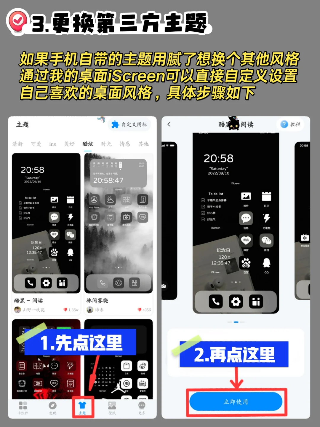 虽然更换图标使用主题公园也可以,但是相对复杂一些,嫌麻烦的宝子可以直接使用我的桌面iScreen设置,里面有很多风格的壁纸,小组件也很多,还有一些现成的模板,不会搞的,就直接参考里面现成的,快去试试吧🏃♂️🏃♂️🏃♂️