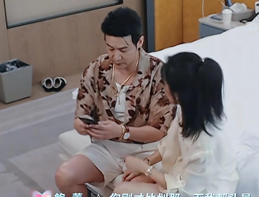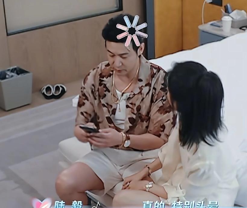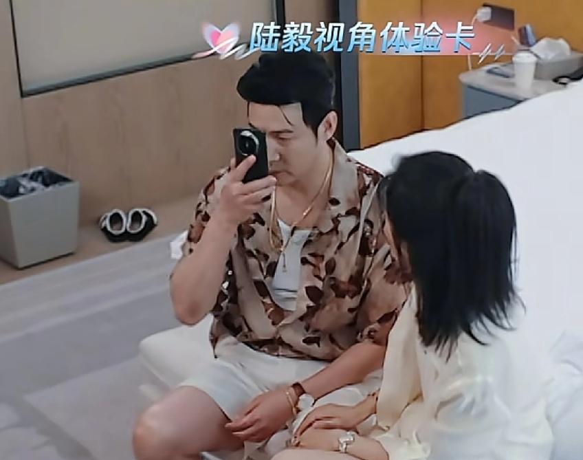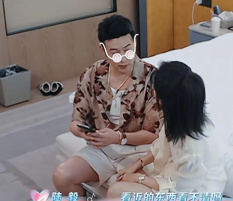 陆毅和鲍蕾一起看手机消息,陆毅要把手机拿得离眼睛很远才能看清楚字,鲍蕾:“这就是