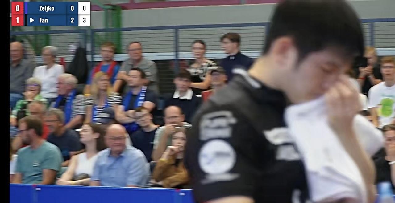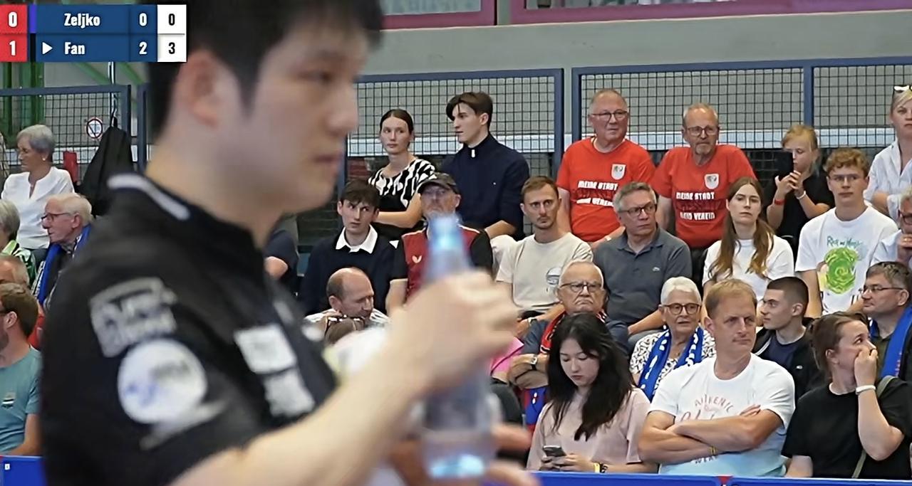 樊振东的德甲首胜来啦,3:1战胜对手,比分是11:5,11:3,7:11,11:6。全场老外球迷都在给樊振东加油,已经不分主队客队了,反正在场的球迷也给樊振东加油,都是樊振东的粉丝。原来老外也喜欢追星,也喜欢乒乓球。现场的氛围真的很好,从这一刻开始,希望樊振东在德甲一直赢下去。
