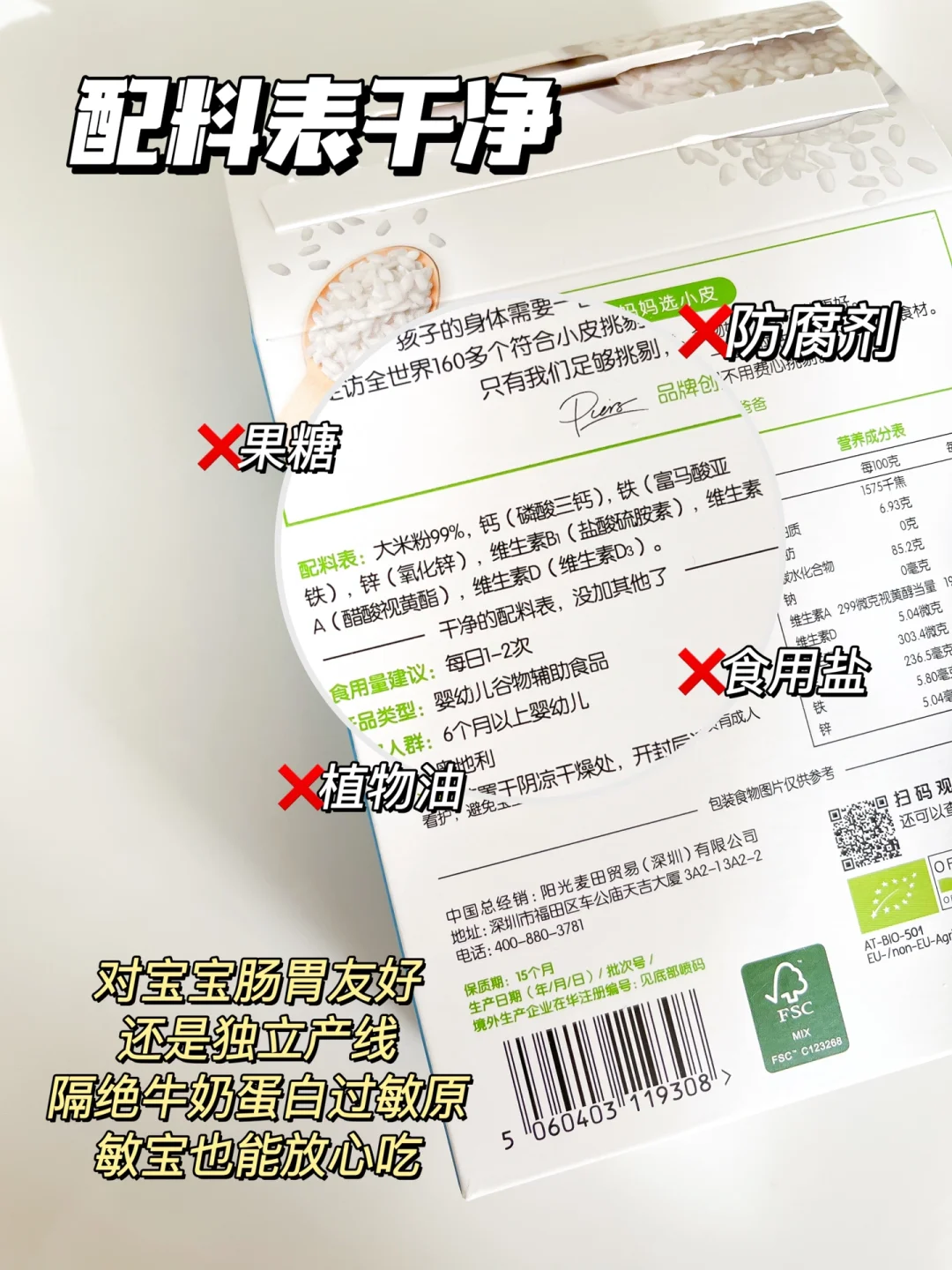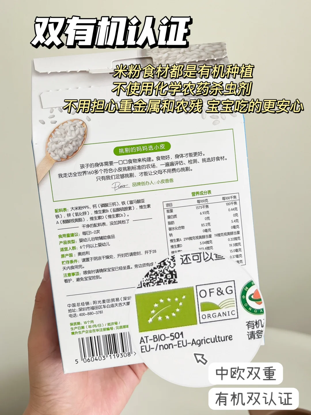 小皮最吸引我的其实还是它是独立的生产线,不混入牛奶蛋白等致敏物,敏宝也能放心吃!还通过了中国及欧盟双重有机认证,米粉的食材都是有机种植,不使用化学农药,不用担心重金属和农残,保证食材安全,让宝宝远离有害物质