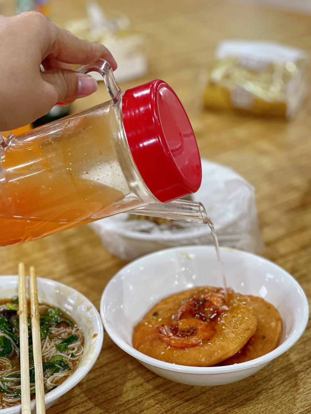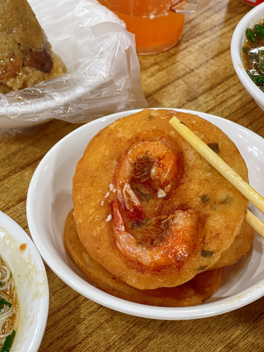 【虾饼】一𝐛𝐚𝐧𝐛𝐚𝐧好吃叭。面皮有点厚.建议加桌上的醋汁会比较好吃.