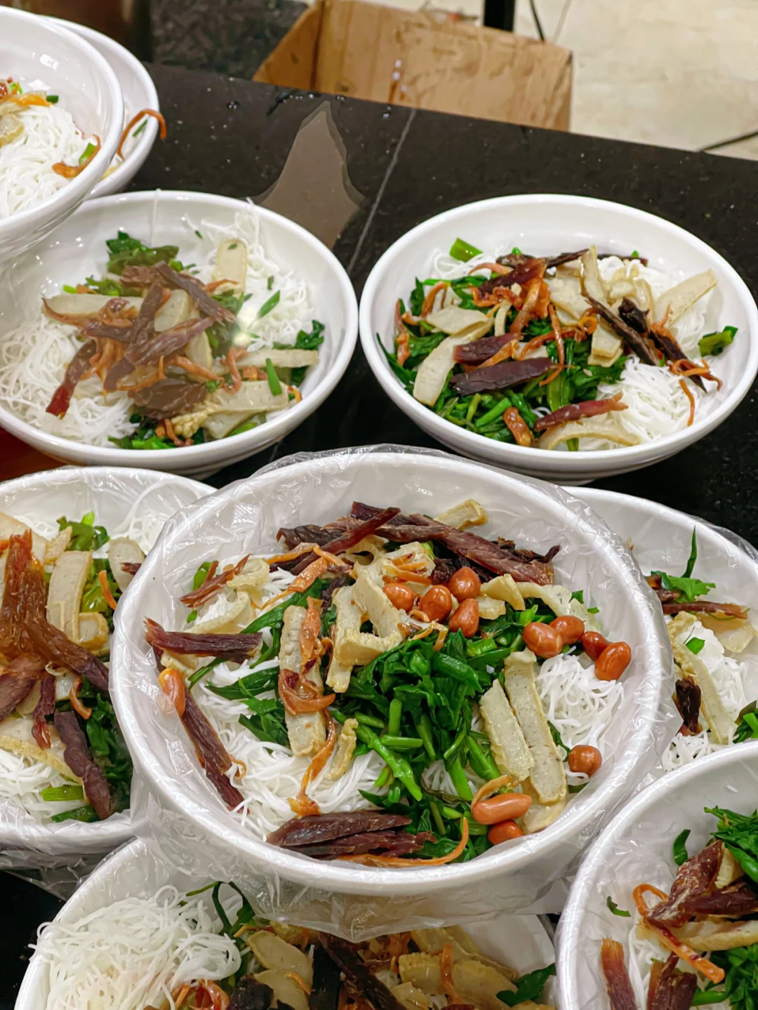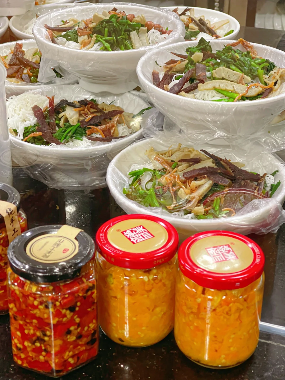 【陵水酸粉】标准版:花生米、犹豫干、牛肉干、鱼饼、韭菜、香菜.有喜欢吃沙虫干的可以另外加.酸味把控的很好.一定要搭配这个黄灯笼辣椒.𝐘𝐘𝐃𝐒~~.酸味不够每张桌都有秘制酸醋.可以随意➕.