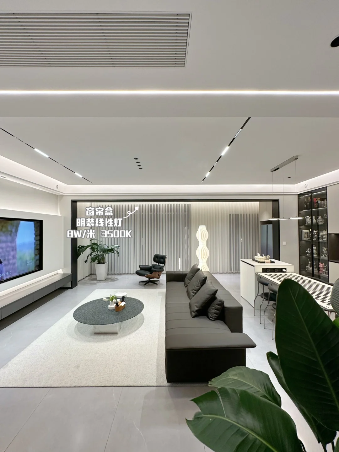 ▪背景墙,窗帘盒和悬浮顶的线性灯:我选的8w/米的低压灯带,需要配合铝型材使用,在木工阶段就要开槽预埋,主要用于整个空间的氛围提升