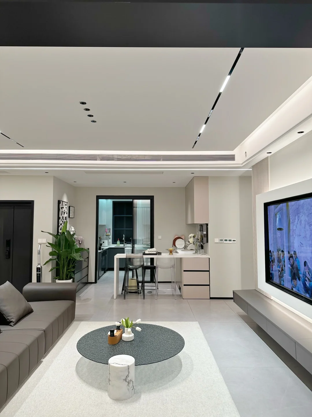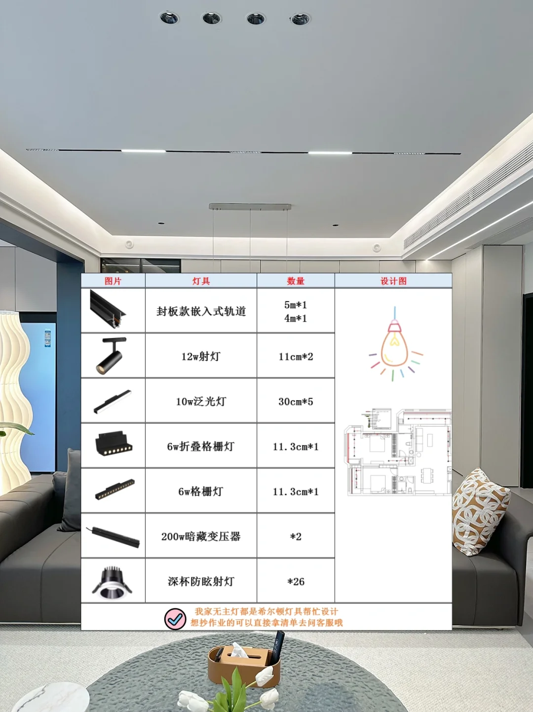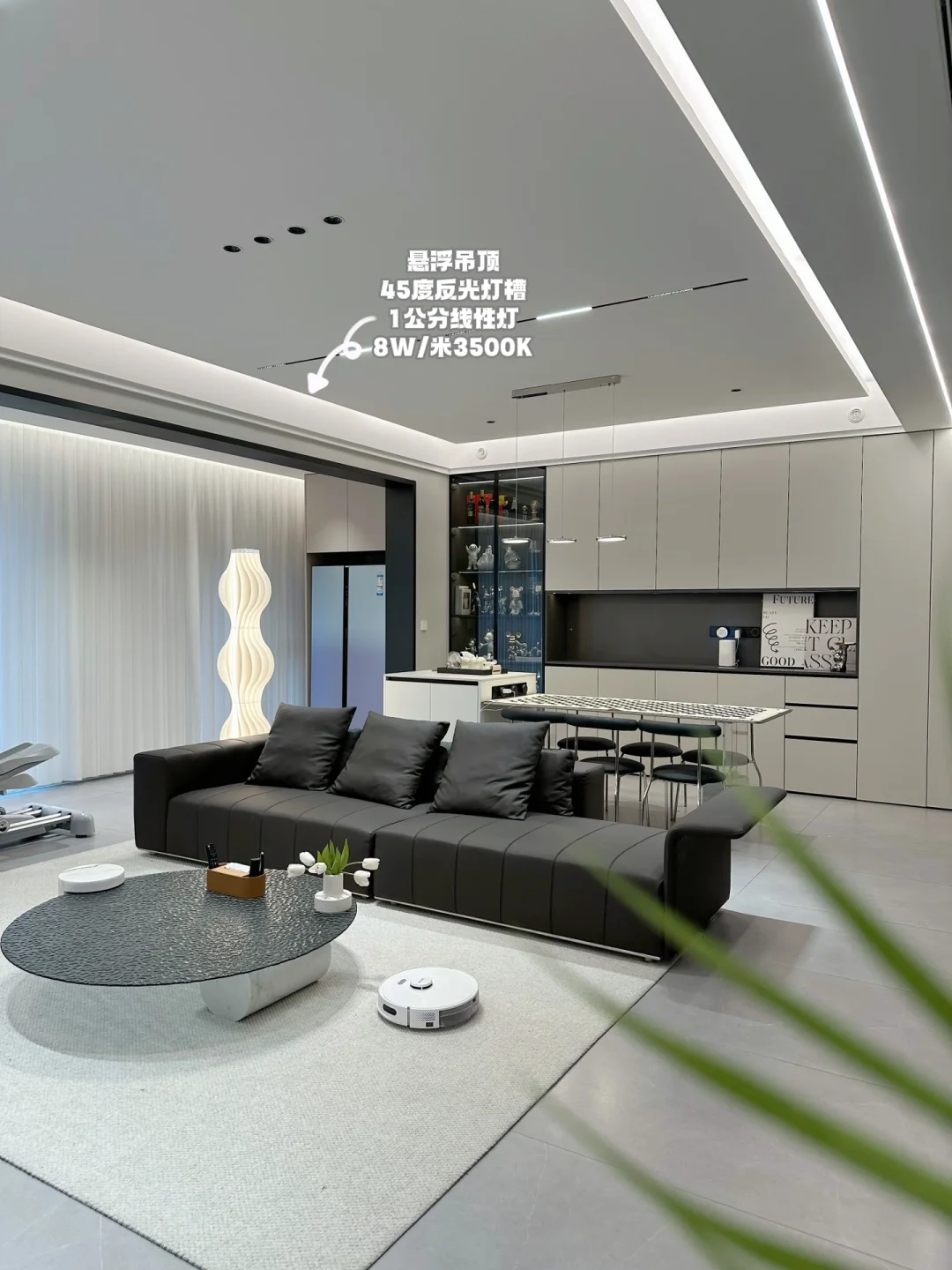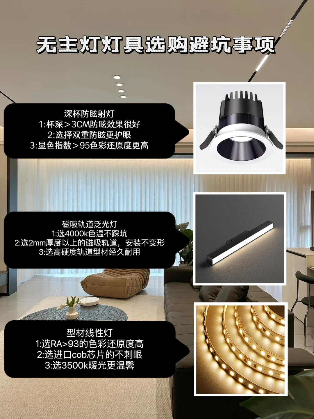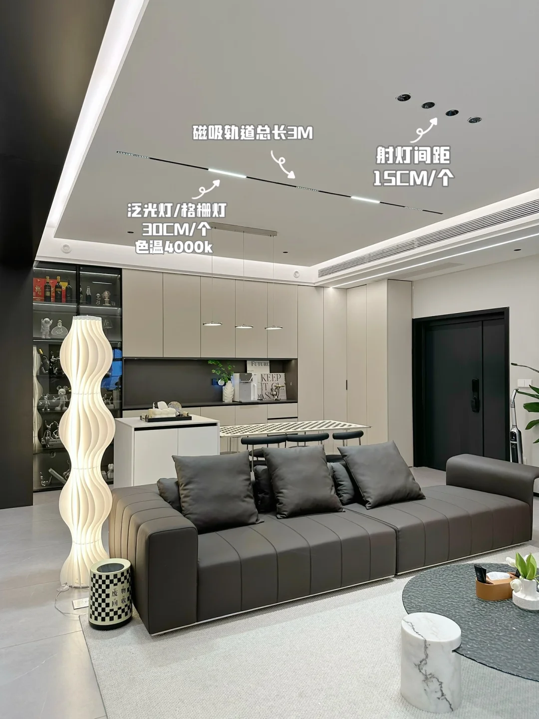 无主灯主要分为点线面几个部分,点就是重点照明比如茶几,背景墙等等,线就是局部照明比如线性灯,面就是主要照明,比如磁吸轨道灯泛光灯,以这个原则来做,就不会踩坑,否则很容易做成满天星,或者照明不够的情况
