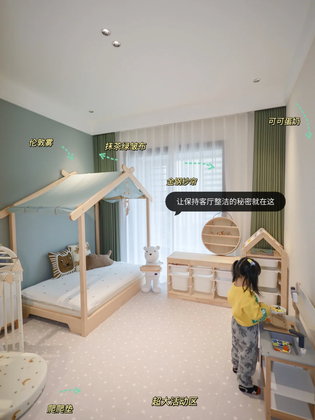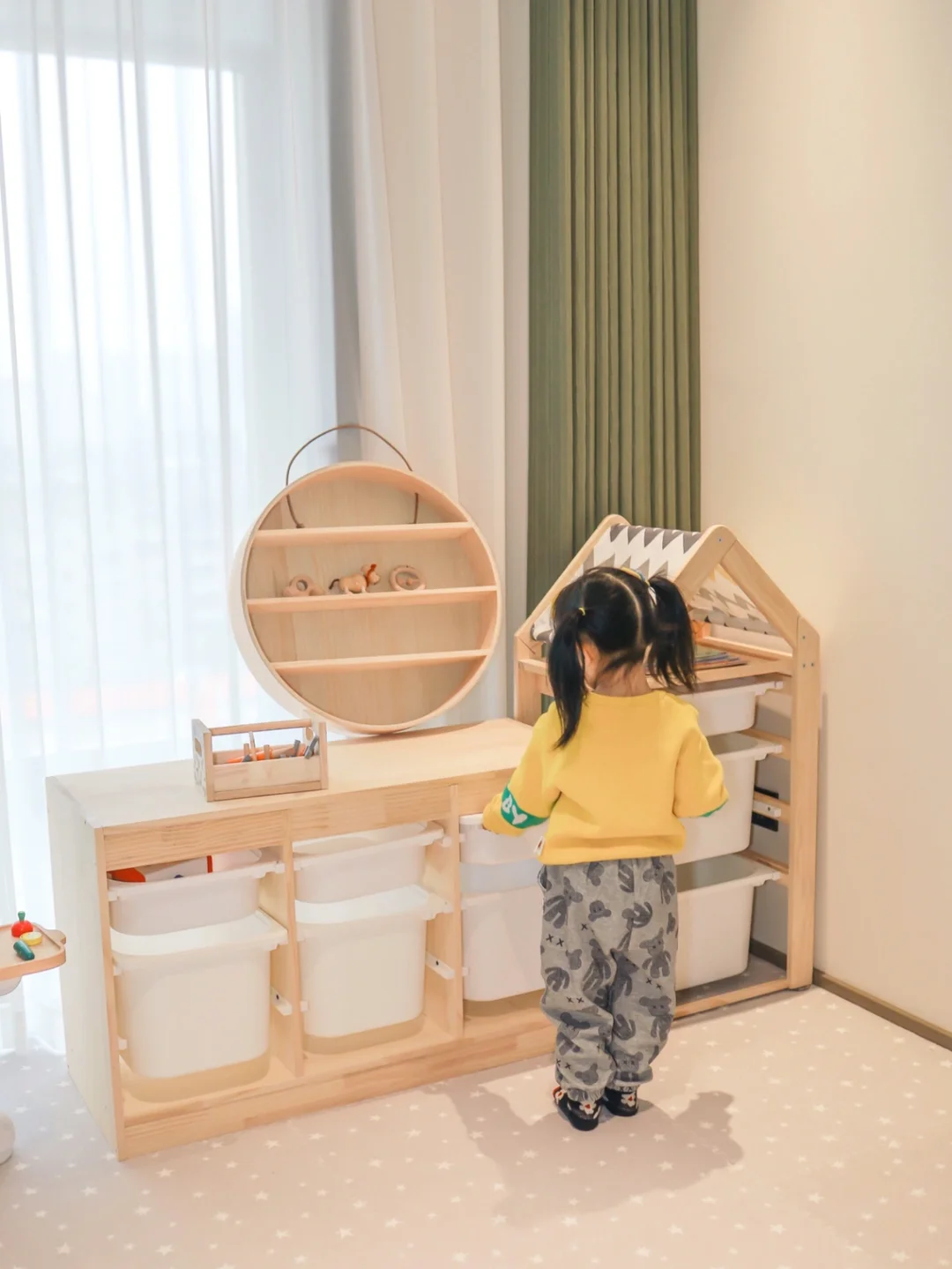 因为房间不大,我拒绝❌所有固定家居,安排的是活动收纳柜,柜体高度更适合小盆友自己分类收纳玩具,在玩耍中锻炼宝宝的分类管理能力!
